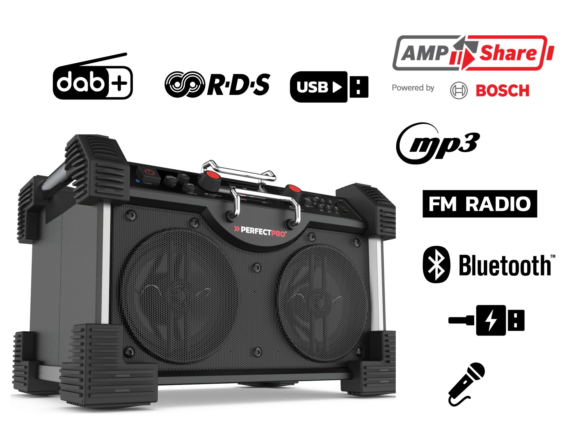 Produkteigenschaften:Perfekstes Set um den PerfectPro Baustellenradio ROCKHART 18V neben dem AMPShare auch mit DeWALT und Milwaukee 18V Akkus zu betreibenBestehend aus dem Baustellenrdio und dem DeWALT Akku-Schlagbohrschrauber DCD709D2T mit 2x 2,0 Ah Powerstack inkl. DeWALT/Milwaukee 18V Akku AdapterPerfectPro Baustellenradio ROCKHART 18V - AMPShare:ROCKHART 18V. AMPShare – Powered by Bosch ProfessionalWas kommt heraus, wenn sich eine führende Marke für Elektrowerkzeuge und eine führende Audiomarke zusammentun?2x das Beste in einem! Das neue ROCKHART 18V - Der BossDas lauteste Baustellenradio der Welt mit Europas größtem Powertool-AkkusystemKompatibel mit allen Bosch Professional 18V Akkus seit 2008Radio UKW & DAB+ DigitalradioBluetooth, AUX In, USB, Powerbank und Stereo PairingKompatibel mit allen Bosch Professional 18V Akkus seit 2008Stoßfest Regen-, schmutz- und staubbeständig103 dB: 2 x 30-Watt-Woofer (60 Watt), 2 Tweeter und ein Hochleistungsverstärke