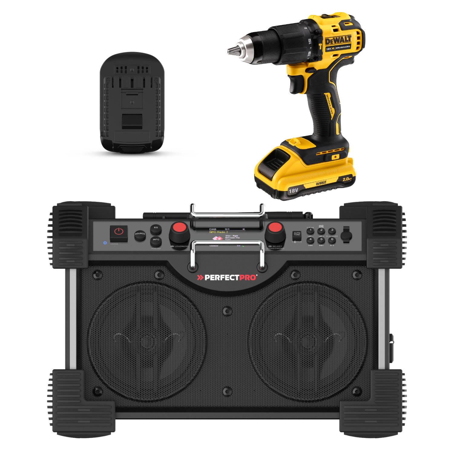 *** Neu ***PerfectPro 18V Multi-Battery System Radio, kompatibel mit:Bosch 18V-Akkus, AMPShare 18V-Akkus (bis 8,0 Ah)Makita 18V-Akkus** (bis 6,0 Ah)DeWalt 18V-Akkus* (bis 5,0 Ah, Ausnahme Powerstack - nur 1,7 Ah)Milwaukee 18V-Akkus* (bis 5,0 Ah)*in Kombination mit dem DeWALT/Milwaukee 18V-Adapter PerfectPro 18V Multi Battery Adapter - im Set mitgeliefert**in Kombination mit dem Makita 18V-Adapter PerfectPro 18V Multi Battery Adapter - separat erhältlichDeWALT Akku-Schlagbohrschrauber DCD709D2T:5-stufiges Drehmomentmodul mit sicherem und zuverlässigem Abschaltmoment gewährleistet präzise Schraubarbeiten in allen EinstellungenLeicht dosierbare Schalterelektronik für exaktes Anbohren und präzises SchraubenLeistungsstarke LED-Leuchte mit sehr hoher Leuchtkraft für problemlosen Arbeiten bei allen LichtverhältnissenMit 2 ultra-kompakten Lithium-Ionen System-Akkus mit LED-Kapazitätsanzeige, einsetzbar in alle 18 Volt XR Akku-MaschinenNeueste Generation leistungsstarker 2-Gang Akku-Schlagbohrschrauber mit weitaus kompakteren Abmessungen und geringerem Gewicht gegenüber vergleichbarem Vorgängermodell Längere Laufzeit pro Akku-Ladung sowie höhere Lebensdauer durch innovative, bürstenlose Motor-TechnologieOptimal abgestimmtes 2-Gang-Vollmetallgetriebe für perfekte KraftübertragungPerfekte Handhabung durch extrem kompakte Bauform mit nur 17,5 cm Gesamtlänge sowie sehr leichte Bauweise und ergonomisch gummierte GriffbereicheProblemloser Einsatz durch robusten Gürtelhaken aus MetallProblemloser Langzeiteinsatz durch Sicherheitselektronik (permanente Überprüfung von Akku-Temperatur, Stromentnahme und Entladeschutz)Robustes 13 mm Schnellspann-Bohrfutter aus Vollmetall mit zentrisch spannenden Backen sowie problemlose Handhabung durch automatische SpindelarretierungTechnische Daten:PerfectPro Baustellenradio ROCKHART 18V - AMPShare:RADIO: DAB+ Digitalradio-Empfang UKW-Empfang mit RDS-Senderinformation 6 Senderspeicher für UKW und DAB+AUDIO: High power 2-Wege-Lautsprechersystem 2 x 30 Watt 2 x 6,5 Zoll Woofer und 2 x 1 Zoll Tweeter Stereo Gehäusevolumen 19 Liter Manuelle Equalizer-Einstellungen für Höhen, Mitten und Bässe 6 standard Equalizer-Einstellungen (Flat – Rock – Pop – Indoor – Outdoor – News) Dynamische Loudness-FunktionEXTRA MEDIA: Bluetooth 5.2 Empfänger für Musikstreaming Stereo Pairing um das Radio zu koppeln mit einem anderen Perfectpro Radio Aux-Eingänge für externen MP3-Player SD karte-Eingänge Mikrofon-EingängeVERSORGUNG/STROM: Bosch Professional 18V Akku (18 bis 22 Stunden mit 4Ah Akku) – Kompatibel mit allen Bosch Professional 18V Akkus seit 2008. Netzbetrieb (230V)AUFLADEN: Nicht aufladbarZUSÄTZLICHE FUNKTIONEN: USB-Stromausgang 5V zum Laden eines Handys Sprache Bedienungsmenü einstellbar NFC Bluetooth pairingAUSSTATTUNG: Gehäuse aus stoßfestem ABS-Kunststoff Beleuchtetes LCD-Display Lautsprechergitter aus Metall Regen- und staubbeständiges Multimedia-Fach (USB, SD, Aux-in) Bedientasten aus Gummi Neopren-Gummistromkabel 3 Meter Kabel-Aufbewahrungsfach an der Rückseite des Radios Flexible, umklappbare Antenne (Typ KDAB1) ”LED”-Anzeige für “Bluetooth verbunden” Rundum Stoßkantenschutz aus Gummi Seitlich 2 Handgriffe aus Metall Flat Top-Design für einfaches Stapeln von WerkzeugkistenKLASSIFIKATIONEN: Stoßfest Regen-, schmutz- und staubbeständig (IP44 norm)ABMESSUNGEN/GEWICHT/FARBE: Gewicht 9,1 kg BxHxT 47 x 31 x 31 cm Farbe: schwarz
