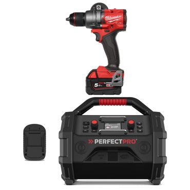 PerfectPro Baustellenradio ROCKTAGON 18V AMPShare:20 Jahre Erfahrung mit Baustellenradios zusammengefasst in einem ultimativen kompakten Powertool-RadioViel (±2x) lauter als sein nächster Konkurrent2x Hochtöner vorne und 2x XL-Allround-Lautsprecher an der Seite für ein Surround-Sound-ErlebnisWirtschaftliches Design (minimaler Materialeinsatz)Regler für niedrige/mittlere/hohe Töne und Equalizer-EinstellungenDAB+-, UKW-, Bluetooth- und AUX-In-FunktionalitätKann über TWS-Stereo-Kopplung mit jedem anderen PerfectPro-Radio gekoppelt und Stereo abgespielt werdenNeueste und Beste (USB-Aufladung, Farbdisplay, BT usw.)Sehr langlebig*** Neu ***PerfectPro 18V Multi-Battery System Radio, kompatibel mit:Bosch 18V-Akkus, AMPShare 18V-Akkus (bis 8,0 Ah)Makita 18V-Akkus** (bis 6,0 Ah)DeWalt 18V-Akkus* (bis 5,0 Ah, Ausnahme Powerstack - nur 1,7 Ah)Milwaukee 18V-Akkus* (bis 5,0 Ah)*in Kombination mit dem DeWALT/Milwaukee 18V-Adapter PerfectPro 18V Multi Battery Adapter - im Set mitgeliefert**in Kombination mit dem Makita 18V-Adapter PerfectPro 18V Multi Battery Adapter - separat erhältlichMilwaukee FUEL™ Akku-Schlagbohrschrauber M18 FPD3-502X:Kompaktes Design mit 175 mm LängeNeu entwickeltes Bohrfutter für verbesserten Bit- und BohrerhaltHelle LED-ArbeitsplatzbeleuchtungHöhere Leistungsfähigkeit unter Last - hohes Drehmoment von 158 NmExtrem kompaktes Design mit einer Länge von 175 mm für optimalen Zugang in engen RäumenAUTOSTOP Funktion, erhöhte Sicherheit13 mm Metallspannfutter für schnellen Bitwechsel und BitsicherungErmöglicht schnelles Bohren unter LastHellere LED-ArbeitsplatzbeleuchtungAkkuladestandanzeige zeigt verbleibende Ladung anGanzmetall-Gürtelclip zum schnellen und einfachen Aufhängen des WerkzeugsDie Überwachung der einzelnen Akkuzellen optimiert die Betriebszeit des Geräts und gewährleistet eine lange Lebensdauer des AkkusDie DNA unserer FUEL-Plattform definiert das Gleichgewicht der kabellosen Technologien neu. Der bürstenlose POWERSTATE-Motor von MILWAUKEE®, der REDLITHIUM-Akku und die elektronische REDLINK PLUS-Intelligenz sorgen für herausragende Leistung, Laufzeit und Haltbarkeit100% systemkompatibel mit dem MILWAUKEE®-M18-ProduktprogrammTechnische Daten:PerfectPro Baustellenradio-Set ROCKTAGON 18V AMPShare:Radio FM DAB+Media BluetoothVersorgung / Strom Netzstrom & 18V Akkus Bosch ProfessionalSpielzeit 16 StundenWiederaufladbar NeinAndere Funktionen AUX-IN, USB-OUT, Stereo-Paring, EqualizerAbmessungen 32 x 23 x 29 cmIP Klassifikation IP65Gewicht 5 KgMilwaukee FUEL™ Akku-Schlagbohrschrauber M18 FPD3-502X:Akku Li-ionAkku im Lieferumfang 2 x M18 B5Akkukapazität [Ah] 5.0Akkusystem M18Bezeichnung: Modellvariante M18 FPD3-502XBohrfutter_Spannbereich [mm] 13By technology FuelGTIN 4058546376543Geliefert in 1 HD BoxGewicht mit Akku [EPTA] [kg] 2.2 (M18 B5)Ladegerät im Lieferumfang M12-18 FCMax. Bohrdurchmesser in Holz [mm] 89Max. Bohrdurchmesser in Stahl [mm] 16Max. Drehmoment [Nm] 158Max. Schlagzahl [min_1] 0 - 33,000Spannung [V] 18Lieferumfang:1x PerfectPro Baustellenradio ROCKTAGON 18V AMPShare1x Perfectpro Multi Battery System-Adapter 18V - Passend für DeWALT und Milwaukee 18V Akkus1x Milwaukee FUEL™ Akku-Schlagbohrschrauber M18 FPD3-502X1x Gürtelclip1x Seitlicher Handgriff2x Akkupack M18 B51x Schnellladegerät M12-18 FC'