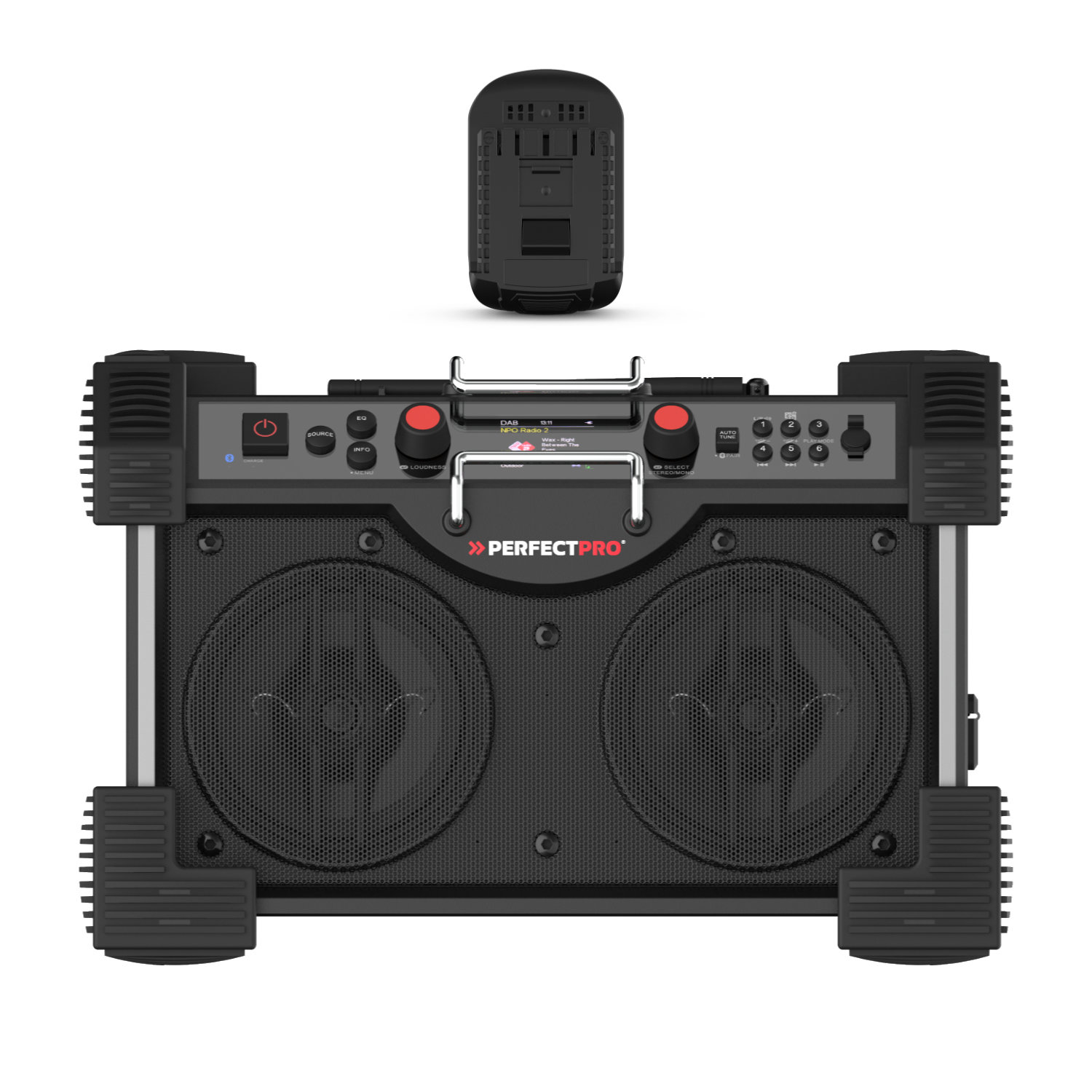*** Neu ***PerfectPro 18V Multi-Battery System Radio, kompatibel mit:Bosch 18V-Akkus, AMPShare 18V-Akkus (bis 8,0 Ah)Makita 18V-Akkus** (bis 6,0 Ah)DeWalt 18V-Akkus* (bis 5,0 Ah, Ausnahme Powerstack - nur 1,7 Ah)Milwaukee 18V-Akkus* (bis 5,0 Ah)*in Kombination mit dem DeWALT/Milwaukee 18V-Adapter PerfectPro 18V Multi Battery Adapter - im Set mitgeliefert**in Kombination mit dem Makita 18V-Adapter PerfectPro 18V Multi Battery Adapter - separat erhältlichTechnische Daten:RADIO: DAB+ Digitalradio-Empfang UKW-Empfang mit RDS-Senderinformation 6 Senderspeicher für UKW und DAB+AUDIO: High power 2-Wege-Lautsprechersystem 2 x 30 Watt 2 x 6,5 Zoll Woofer und 2 x 1 Zoll Tweeter Stereo Gehäusevolumen 19 Liter Manuelle Equalizer-Einstellungen für Höhen, Mitten und Bässe 6 standard Equalizer-Einstellungen (Flat – Rock – Pop – Indoor – Outdoor – News) Dynamische Loudness-FunktionEXTRA MEDIA: Bluetooth 5.2 Empfänger für Musikstreaming Stereo Pairing um das Radio zu koppeln mit einem anderen Perfectpro Radio Aux-Eingänge für externen MP3-Player SD karte-Eingänge Mikrofon-EingängeVERSORGUNG/STROM: Bosch Professional 18V Akku (18 bis 22 Stunden mit 4Ah Akku) – Kompatibel mit allen Bosch Professional 18V Akkus seit 2008. Netzbetrieb (230V)AUFLADEN: Nicht aufladbarZUSÄTZLICHE FUNKTIONEN: USB-Stromausgang 5V zum Laden eines Handys Sprache Bedienungsmenü einstellbar NFC Bluetooth pairingAUSSTATTUNG: Gehäuse aus stoßfestem ABS-Kunststoff Beleuchtetes LCD-Display Lautsprechergitter aus Metall Regen- und staubbeständiges Multimedia-Fach (USB, SD, Aux-in) Bedientasten aus Gummi Neopren-Gummistromkabel 3 Meter Kabel-Aufbewahrungsfach an der Rückseite des Radios Flexible, umklappbare Antenne (Typ KDAB1) ”LED”-Anzeige für “Bluetooth verbunden” Rundum Stoßkantenschutz aus Gummi Seitlich 2 Handgriffe aus Metall Flat Top-Design für einfaches Stapeln von WerkzeugkistenKLASSIFIKATIONEN: Stoßfest Regen-, schmutz- und staubbeständig (IP44 norm)ABMESSUNGEN/GEWICHT/FARBE: Gewicht 9,1 kg BxHxT 47 x 31 x 31 cm Farbe: schwarz