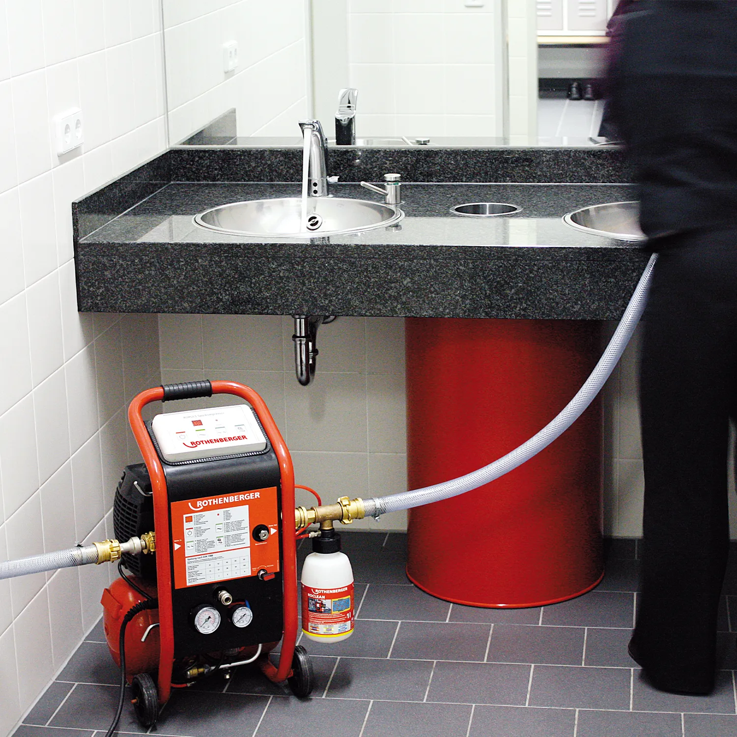 Der Spülkompressor ROPULS D inklusive Schlauchsystem ist für typische Service- und Wartungsarbeiten im SHK-Bereich ausgelegt. Er eignet sich zum Reinigen und Entschlammen von Heizkreisen sowie zum Spülen von Trinkwasserleitungen im Rahmen der geltenden Vorgaben nach DIN 1988-2 und EN 806-4. Auch die Desinfektion von Trinkwasserleitungen lässt sich mit dem passenden Zubehör zuverlässig umsetzen.