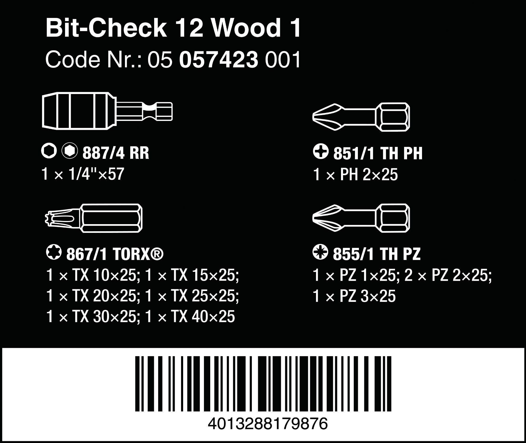 Deutschland 0202/40450 Wera Bit-Check 12 Wood 1, 12‑teilig PH / PZ / TX Artikel-Nr.: 05057423001 EAN: 4013288179876 Hersteller: WERA