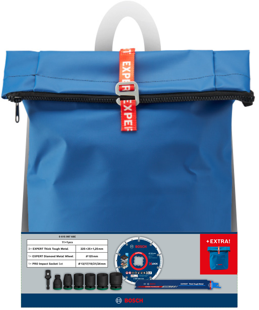 Produkteigenschaften: Bosch EXPERT / PRO Werzeug-Set im praktisschen Bosch EXPERT Rucksack Bestehend aus, Säbelsägeblatt, Diamant-Trennscheibe 125 mm und Impact Steckschlüssel-SatzTechnische Daten: Inhalt 11 tlg.Lieferumfang: 3x Bosch EXPERT Säbelsägeblatt Thick Tough Metall 225 x 25 x 1,25 1x Bosch EXPERT Diamant-Trennscheibe 125 mm 1x Bosch PRO Impact Steckschlüssel-Satz 13/17/19/21/24 mm und Adapter