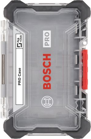 Das PRO Case hilft dir, deine Schrauberbits, Bohrer und Schrauben zu organisieren und sicher aufzubewahren. Du kannst den Koffer einfach verriegeln und öffnen. Er ist mit dem Bosch Pick and Click Koffer kompatibel, d. h. du kannst ihn einfach einklicken, um deinen eigenen Werkzeugkasten zusammenzustellen.