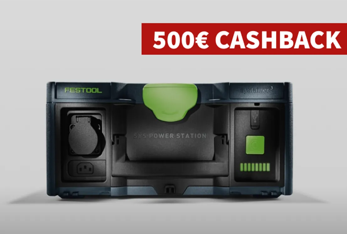 Festool Cashback Die Festool Cashback-Aktion zur SYS-PowerStation mit 500 € Rückvergütung ist inzwischen abgelaufen. Jetzt die Festool Cashback entdecken