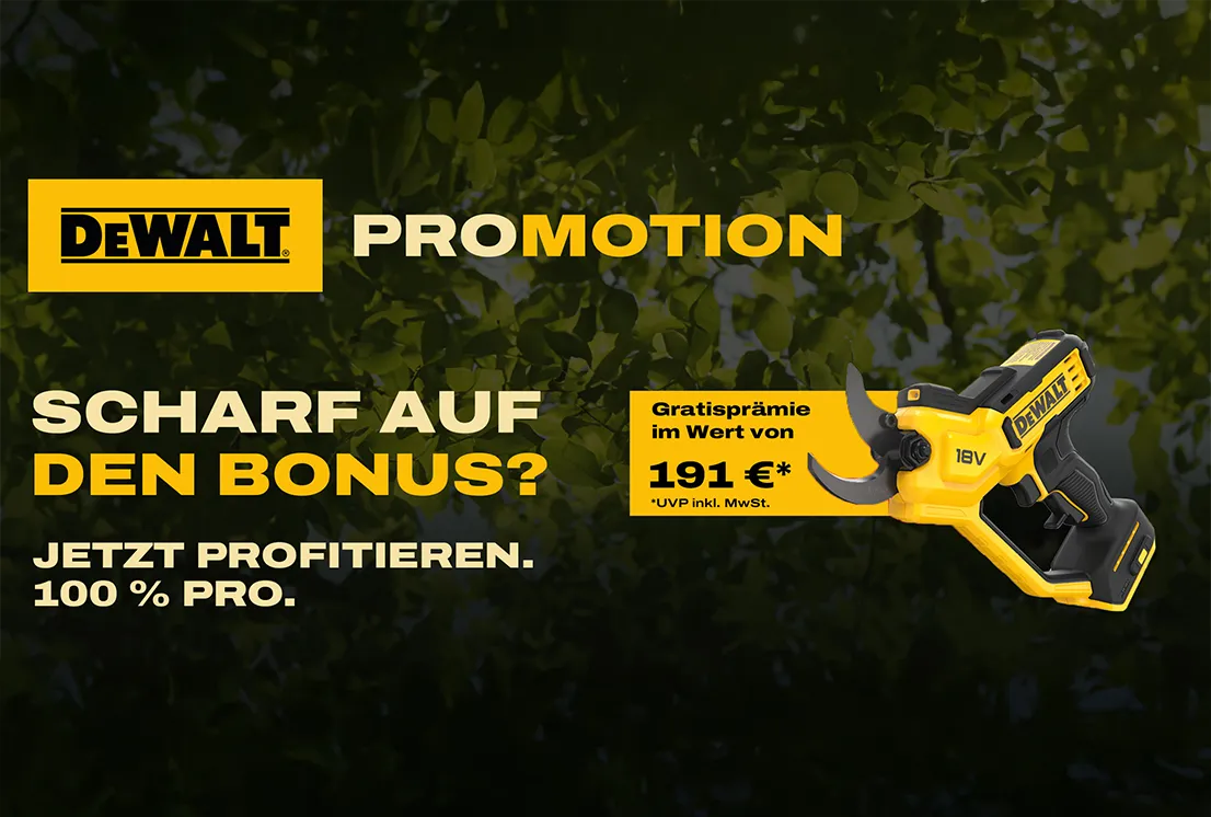 Dewalt Scharf auf den Bonus Sichere dir jetzt deine gratis DeWalt Akku-Astschere, wenn du im Aktionszeitraum vom 01.08. bis 08.11.2025 zwei Outdoor-Maschinen aus dem DeWalt 18V- oder 54V-Sortiment kaufst. Zur DeWalt Outdoor Aktion