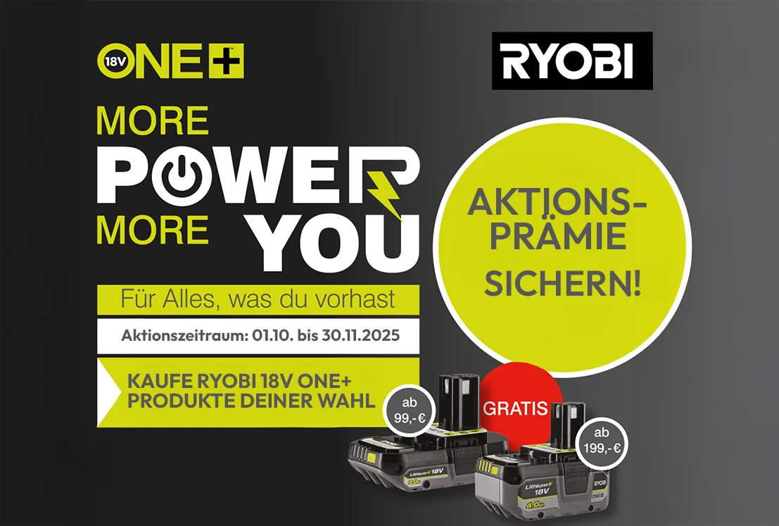 Ryobi Prämien-Aktion Starte jetzt in die RYOBI ONE+ Herbstaktion!Sichere dir beim Kauf ausgewählter RYOBI ONE+ Produkte ab 99 € oder 199 € deinen Gratis-Akku. Nur bis 30.11.2025 – schnell zugreifen! Jetzt RYOBI Gratis-Akku sichern