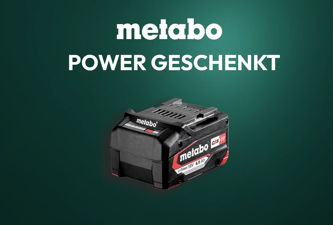 Metabo Akku Aktion Jetzt Metabo Aktionsprodukt kaufen, registrieren und gratis einen 18V LiPOWER 4.0 Ah Akkupack sichern – nur im Aktionszeitraum vom 01.10.2025 bis 31.03.2026 und nur solange der Vorrat reicht! Jetzt gratis Akku sichern