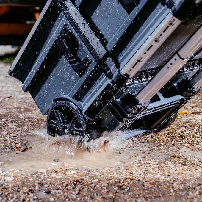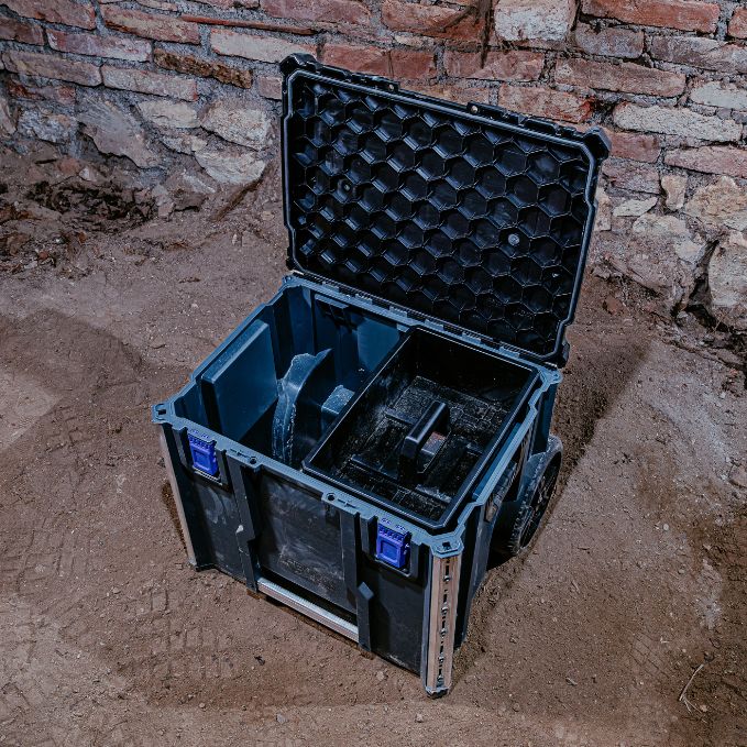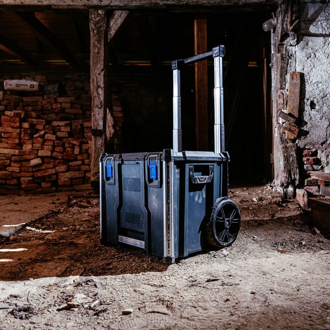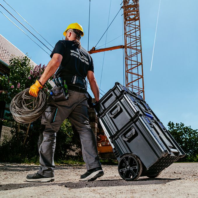 Produktbeschreibung:Hart im Nehmen, leicht zu rollen: Der Werkzeugtrolley L-BOXX Contractor Large Rolling Tool Box ist Dein kraftsparender Helfer auf RädernMit bis zu 113kg Traglast bringt sie Werkzeug, Zubehör und Verbrauchsmaterial sicher ans Ziel - auf der Baustelle, in der Werkstatt oder im FahrzeugNach IP65 wetterfest gebaut, schützt sie zuverlässig, was Dir wichtig istDu willst lieber clever organisieren statt improvisieren? Kein Problem. Die Rolling Tool Box ist voll kompatibel mit dem L-BOXX Contractor und dem ProClick System sowie der millionenfach bewährten L-BOXX BaselineDie integrierten Aluminiumschienen bieten Stabilität und dienen als Andockpunkt für ProClick Werkzeugtaschen, die M6-Innengewinde ermöglichen zusätzliche AnbindungsmöglichkeitenEin Zusatzfach nimmt langstielige Werkzeuge wie Besen oder Wasserwaage aufDer Teleskopgriff schont Rücken und Gelenke - und versenkt sich platzsparend für den Fahrzeugtransport auf KofferhöheIm Innenraum punktet die rollende Werkzeugkiste mit viel Platz - die im Lieferumfang enthaltene Einhängekiste garantiert zudem eine flexible Unterteilung und bringt Ordnung ins WerkzeugchaosPer Klickmechanismus stapelbar, per Cubingkonzept zum stabilen Unterbau für eine mobile Arbeitsfläche erweiterbar - so entsteht vor Ort Ordnung und Struktur mit MehrwertUnd wenn Sicherheit auch noch eine Rolle spielt - dann kannst Du dank Safety Lock Deinen Werkzeugkoffer einfach mit zwei optionalen Vorhängeschlössern absperrenAlles verstaut. Alles im Griff. Die L-BOXX Contractor Large Rolling Tool Box ist die Basis für Deine rollende Werkstatt - für Profis, die mehr bewegen wollen und lieber rollen als rackern.Technische Daten:Farbe: Schwarz / Anthrazit / UltramarinblauAußenmaße in mm: B559 x T531 x H476Gewicht in kg: 10,8Lieferumfang:1x L-BOXX Contractor Werkzeugtrolley Large Rolling Tool Box