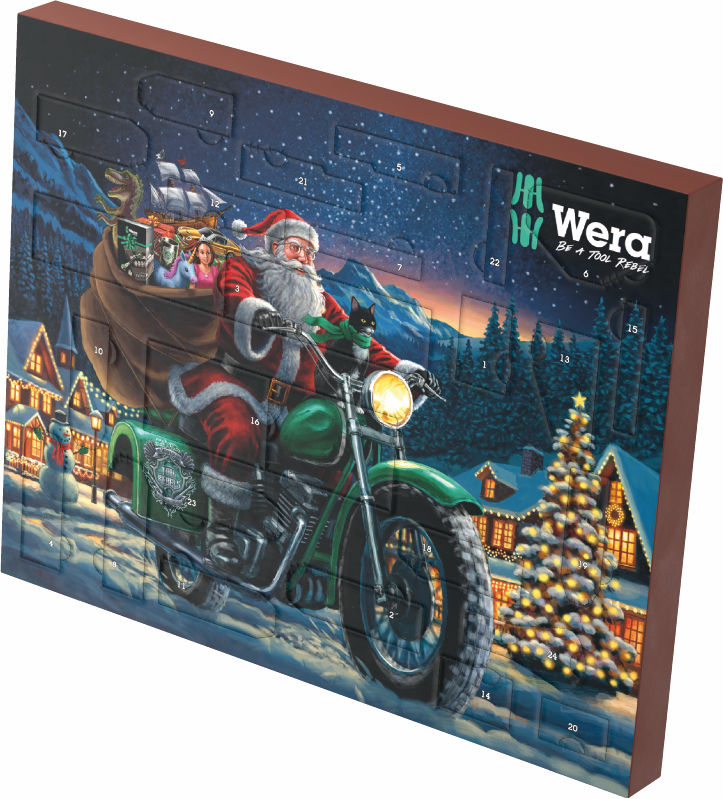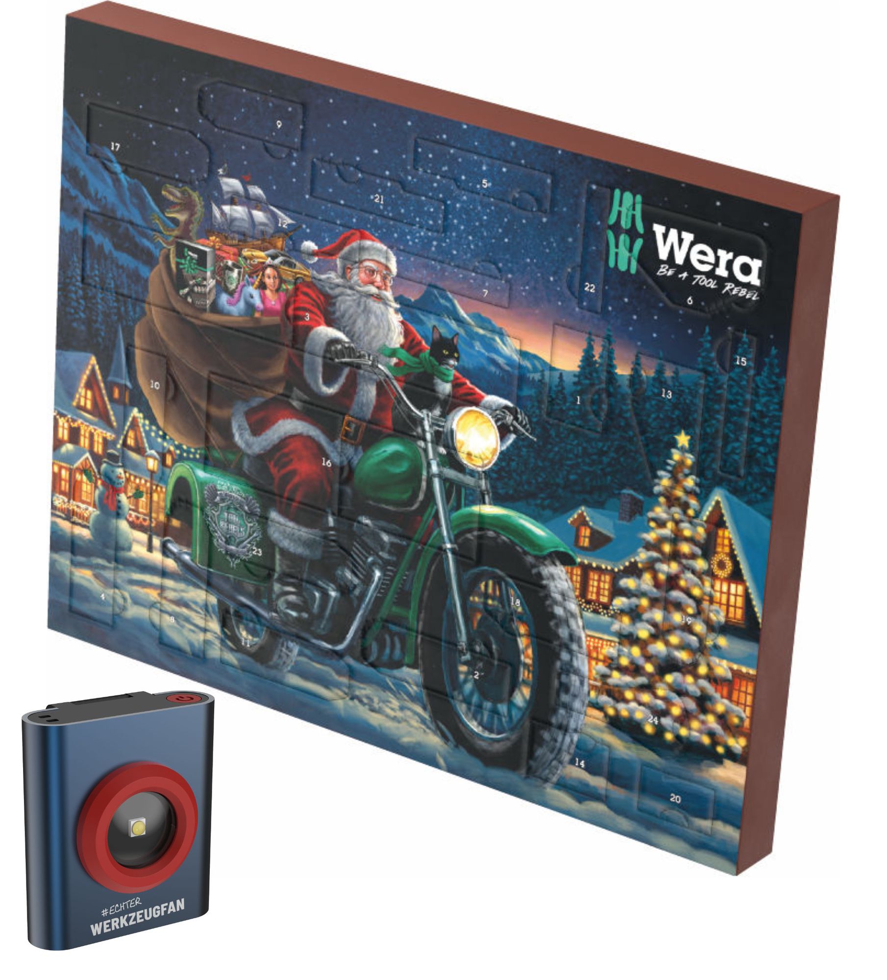 Produkteigenschaften:Wera Adventskalender 2025:Der Wera Adventskalender beinhaltet 2025 eine umfassende Schraubwerkstatt für die gängigsten Schraubprofile und AnwendungenDie beiden mitgelieferten Racks können aufgestellt oder an der Wand befestigt werdenAuf 28 Überraschungen darf sich der der Beschenkte/die Beschenkte freuen: 15 Schraubendreher, darunter 2 Schlitzwerkzeuge für VDE, 2 Stubbys, 3 Micro Werkzeuge für die Feinmechanik und einen Schraubmeißel mit Schlagkappe und durchgehender Klinge1 Bithalter mit Quergriff für ¼" Bits und 3 lange Bits (89 mm) runden den Inhalt abDer Quergriff liegt gut in der Hand und erlaubt die Übertragung hoher DrehmomenteDie beiden Schraubkrallen halten Schrauben sicher auf dem WerkzeugDer Flaschenöffner ist ein Muss für alle Adventskalender Fans, auch 2025 im speziellen und nur im Kalender enthaltenen Design2 Racks sorgen für ordentliche Verstauung aller Werkzeuge (und des Flaschenöffners)
