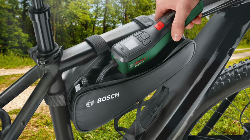 Produktbeschreibung: Akku-Druckluftpumpe EasyPump. Kompakt und handlich: Aufpumpen von Fahrradreifen und Bällen zu Hause oder unterwegs. Aufpumpen bis 10,3 bar mit Echtzeitmessung und Autostopp-Funktion. Ideal zum Aufpumpen von Reifen (Auto, Motorrad, Fahrrad), Bällen und kleineren Wassersportartikeln. Alles griffbereit zur Hand: Verschiedene Adapter sind ordentlich im Werkzeuggriff verstaut. Intuitiv und praktisch: bedienerfreundliches, ergonomisches und kleines Design mit großem Display. Integrierter Akku und USB-C®-Ladung, helle Beleuchtung durch LED-Licht. Französisches Ventil. Ballnadel. Volumenadapter. Luftpumpenadapter für Reifenventile. USB-Kabel. Tasche für FahrradrahmenTechnische Daten: Akkuspannung: 3,6 V Ah, max.: 3 Ah Max. Druck: 10 bar Max. Druck: 150 psi Max. Druck: 1.030 kPa Max. Leistungsvolumen: 10 l/min Schlauchlänge: 0,2 m Werkzeugabmessungen (L x B x H): 49 x 215 x 106 mm Gewicht: 0,430 kg Verpackungsmaße (L x B x H): 315 x 135 x 77 mmLieferumfang: 1x Bosch Akku-Druckluftpumpe EasyPump mit Luftpumpenadapter für Reifenventile