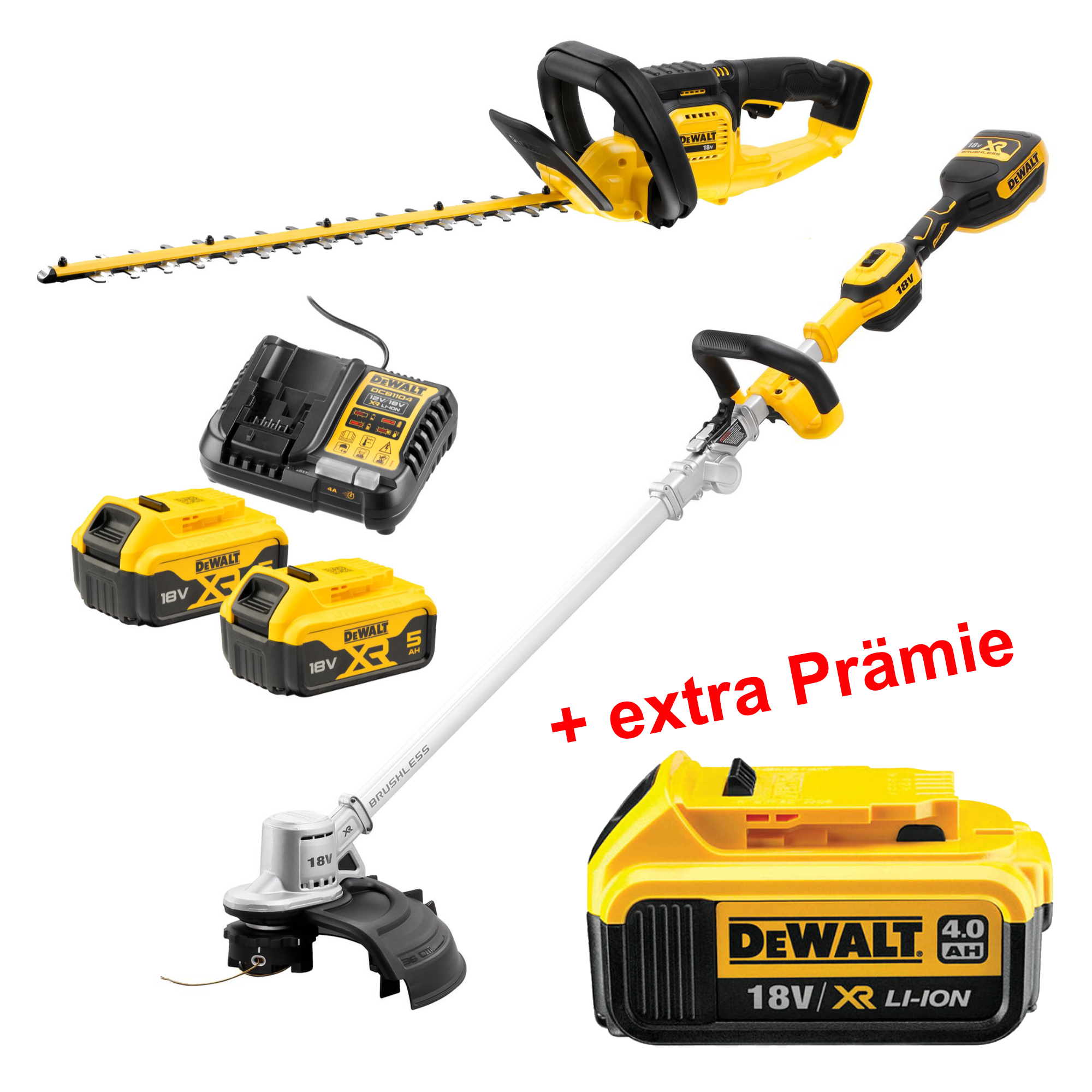 Produkteigenschaften:Komplettes Starterset von DeWALT Akku-GartenmaschinenBestehend aus Akku-Heckenschere, Akku Rasentrimmer inkl. 2 passenden Akkupacks und dem Ladegerät
