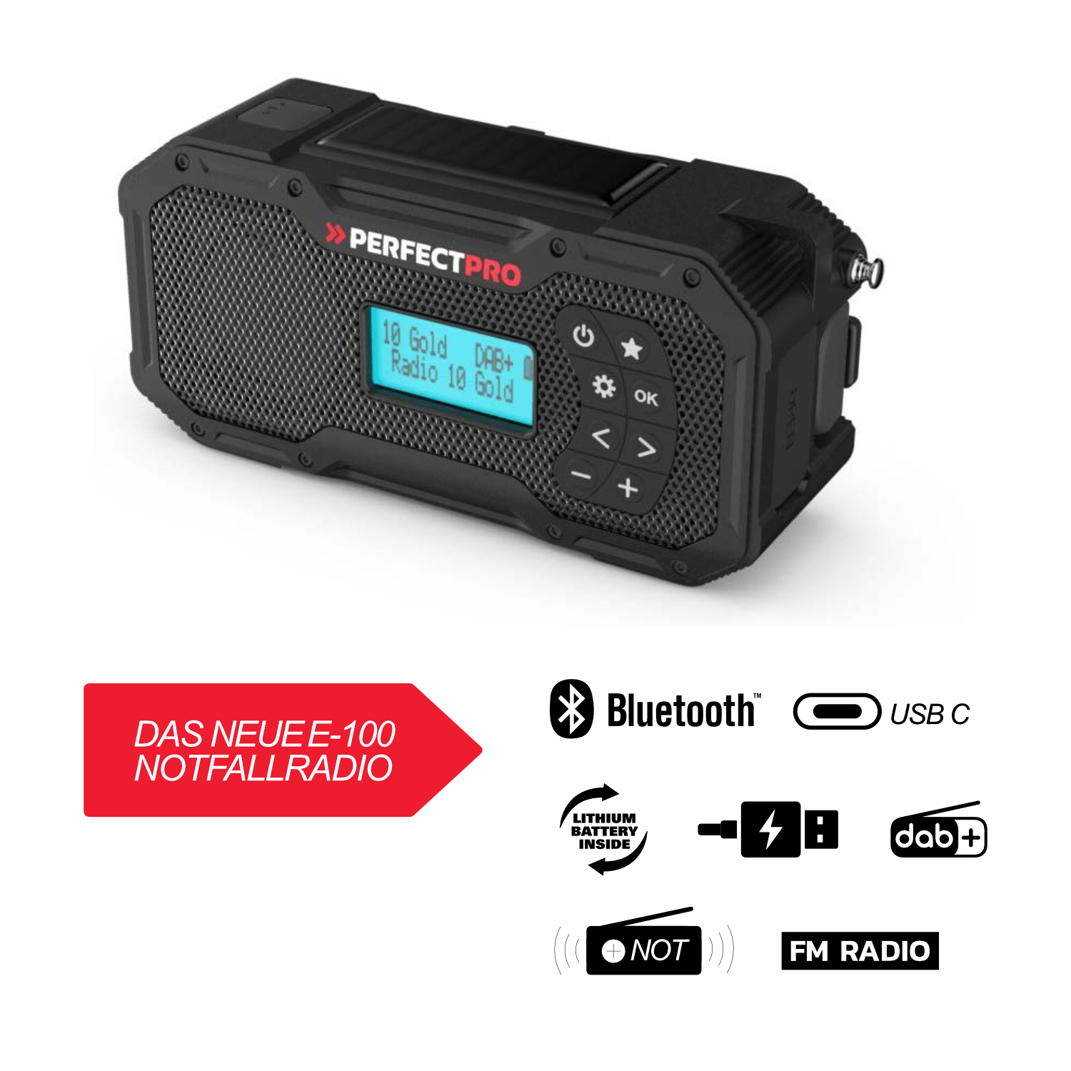 Lieferumfang:1xPerfectPro Notfallradio E-100 mit DAB+ / FM / Bluetooth