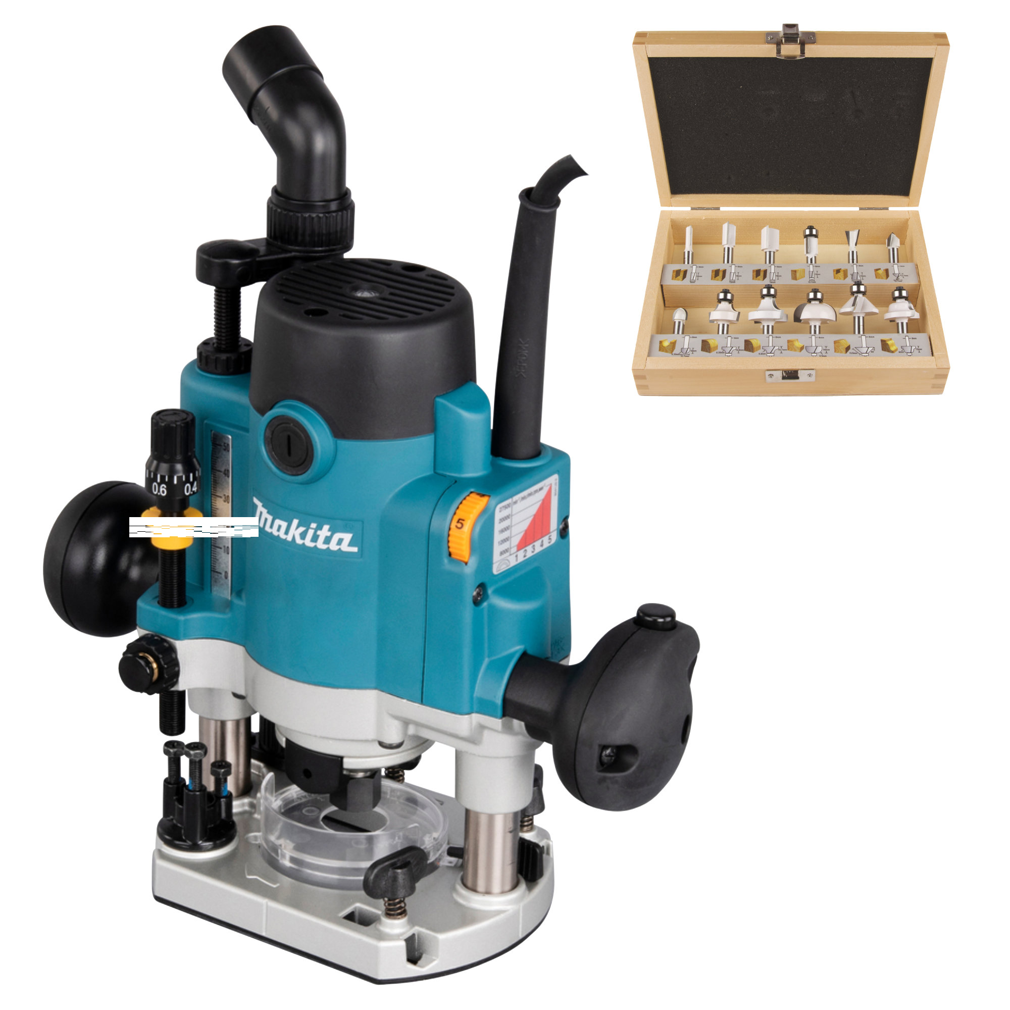 Produkteigenschaften: Handliche Oberfräse zum Bündigfräsen und Profildrehen von Holz, Kunststoff und ähnlichen Materialien Eine kompakte Oberfräse mit einem starken 1.100 W Motor für Fräser mit 8 mm Schaftdurchmesser Praktische Tiefenanschlagarretierung per Knopfdruck und 3-stufige Revolver-Tiefeneinstellung Mit Sanftanlauf und 5-stufig regelbare Drehzahl Die Anti-Restart-Funktion verhindert ein ungewolltes Anlaufen der Maschine nach einer SpannungsunterbrechungTechnische Daten: Leistungsaufnahme: 1100 W Leerlaufdrehzahl: 8000 - 27500 min¹ Eintauchtiefe: 0 - 57 mm Werkzeugaufnahme: 8 mm Schallleistungspegel (LWA ): 104 dB(A) Schalldruckpegel (LpA ): 93 dB(A) K-Wert Geräusch: 3 dB(A) Vibrationswerte, Nutfräsen in MDF: 4,4 m/s² Vibrationsunsicherheitsfaktor (K-Wert), Fräsen in MDF: 1,5 m/s² Gewicht ohne Kabel: 3,3 kg Produktabmessung (L x B x H): 110 x 269 x 260 mm Saugschlauchanschluss Ø innen/außen: 32/37 mm Länge des Netzkabels: 4,0 mLieferumfang: 1x Makita Oberfräse RP1111CJFA 1x Absaugrohr 122609-9 1x Absaugstutzen 122615-4 1x Parallelanschlag 164834-6 1x Spannzange 8 mm Set 1x Führungshülse 12,0 mm 1x Adapter für Führungsschiene 194579-2 1x Schlüsselweite SW 17 781008-0 2x Schraube M4x10 915111-7 1x Tiefziehteil für MAKPAC 837646-7 1x MAKPAC Gr. 3 821551-8 1x Fräser-Set 8 mm D-53556