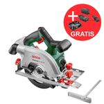 Produktbeschreibung: Akku-Kreissäge UniversalCirc 18V-53. Kraftvolle Kreissäge für präzise Geradschnitte. Geeignet für die meisten Holzanwendungen dank einer Schnittkapazität von 53 mm. Hartmetallbestücktes 160-mm-Premium-Sägeblatt Optiline für exaktes Sägen. Bosch Home & Garden Führungsschienensystem für präzise Gerad- und Gehrungsschnitte. Beeindruckende Schnittkapazität von 33 m pro 2,5-Ah-Akkuladung (bei 19-mm-Spanplatte). Ideal für den Bau von Regalen oder Zuschnitt von Terrassendielen. Saugeranschluss für eine Absaugrate von über 90 %. Kompatibel mit Bosch 18V POWER FOR ALL-Akku.Technische Daten: Akkuspannung: 18,0 V Kompatibler Akku: 18V POWER FOR ALL ALLIANCE Akku-Empfehlung: >= 2,5 Ah Kreissägeblatt Nenn-Ø: 160 mm Kreissägeblatt Bohrungs-Ø: 20 mm Leerlaufdrehzahl: 4.300 min-1 Schutzhaube: Aluminium Schnitttiefenbereich bei 90°, von: 0 mm Schnitttiefenbereich bei 90°, bis: 53 mm Schnitttiefenbereich bei 90°: 0 - 53 mm Schnitttiefenbereich bei 45°, von: 0 mm Schnitttiefenbereich bei 45°, bis: 36 mm Schnitttiefenbereich bei 45°: 0 - 36 mm Werkzeugabmessungen (L x B x H): 315 x 181 x 266 mm Gewicht: 3,300 kg Gewicht exkl. Akku: 2,9 kgLieferumfang: 1x Bosch Akku-Kreiss UniversalCirc 18V-53 1x Kreissägeblatt Optiline Wood (2 608 641 171). 1x Absaugadapter (1 609 203 X86). 1x Parallelanschlag (2 608 005 018). (ohne Akku und Ladegerät)