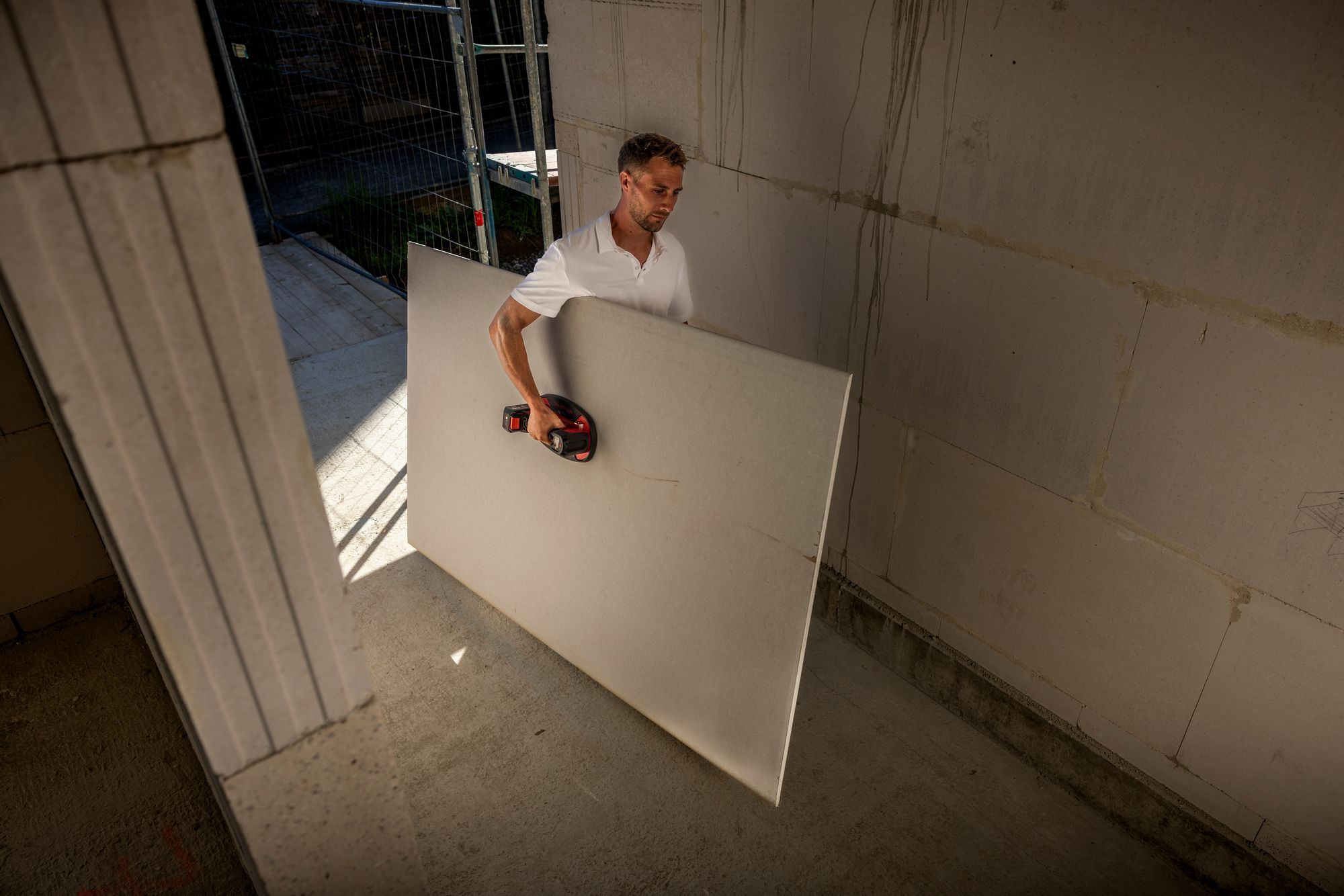 Produkteigenschaften: Mit dem ergonomisch gestalteten, mobilen, elektrischen Vakuumlifter können Sie fast jeden Gegenstand mühelos heben, bewegen und präzise platzieren Dieser Vakuumheber ist für verschiedene Materialien wie Fliesen, Gipskartonplatten, Betonsteine, Glas, Metalle, Möbel und große Elektrogeräte geeignet Sein leistungsstarker Betrieb gewährleistet eine effiziente und zuverlässige Handhabung schwerer Gegenstände Der Vakuumheber hat eine Haltekraft von bis zu 120 kg und saugt auf nahezu jeder Oberfläche, auch auf staubigen, rauen oder halbporösen Materialien Die Arbeitssicherheit steht dabei an erster Stelle. Der Vakuumheber ist mit einer automatischen Konstantsaugfunktion ausgestattet und die digitale Anzeige informiert kontinuierlich über das aktuelle Vakuum Mit einer leistungsstarken Vakuumpumpe, die bei maximalem Vakuum automatisch stoppt Das elektronische Managementsystem (EMS) schützt die Maschine, verlängert ihre Lebensdauer und erhöht die Effizienz LED Akku-Kapazitätsanzeige FLEX Akku-System: Betrieb mit allen FLEX 18,0 V AkkupacksTechnische Daten: Akkuspannung 18.0 V Nennluftstrom 20 l/min Max. Vakuum 0,8 bar Max. Tragfähigkeit 130 kg Arbeitstemperatur 0°~60 ° Abmessung LxBxH 300 x 184 x 121 mm Schaltertyp Ein/Aus Gewicht ohne Akkupack 1,48 kg