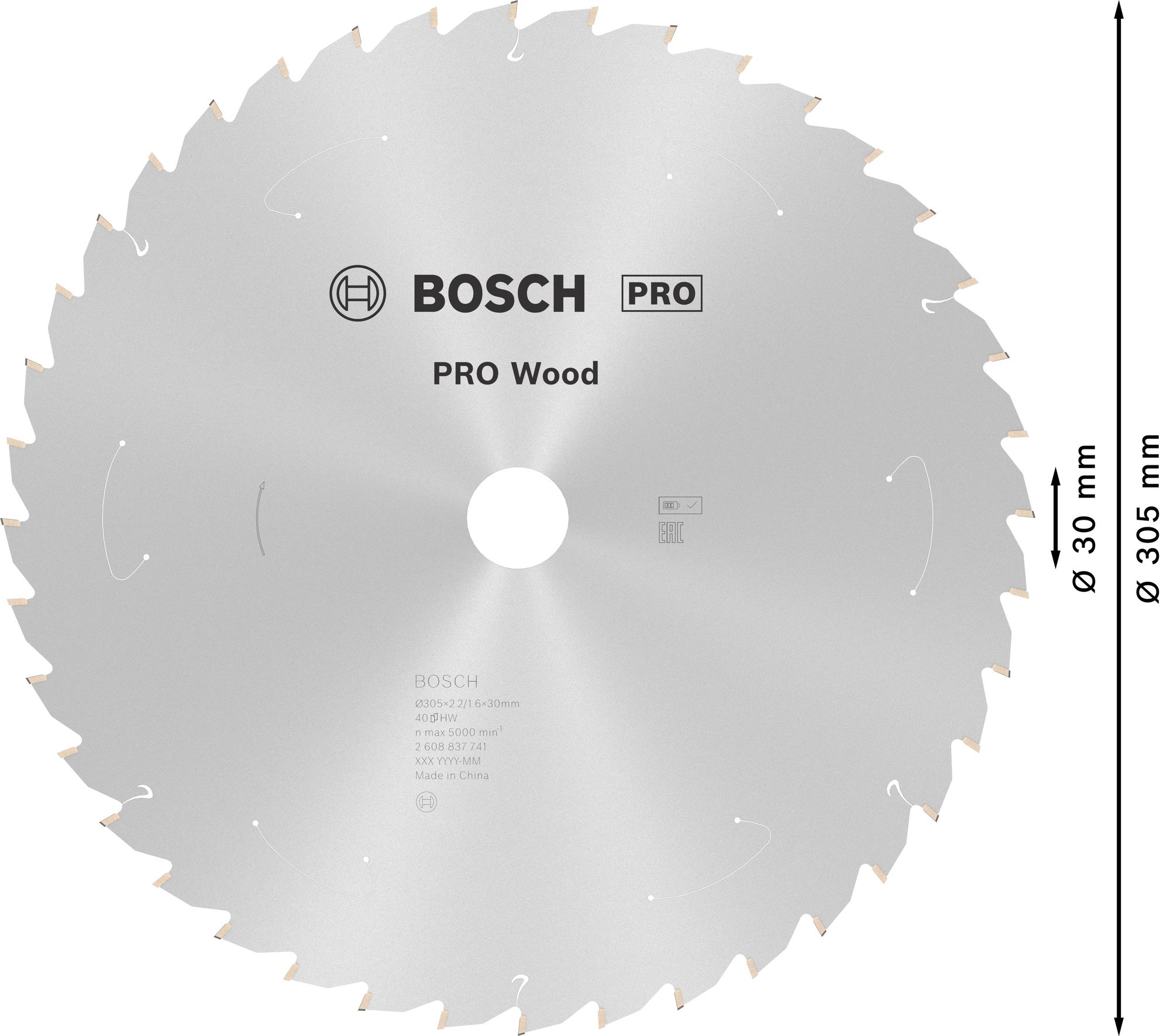 Lieferumfang: 1x Bosch PRO Wood cordless Kreissägeblatt, 305 x 2,2 x 30 mm, T40