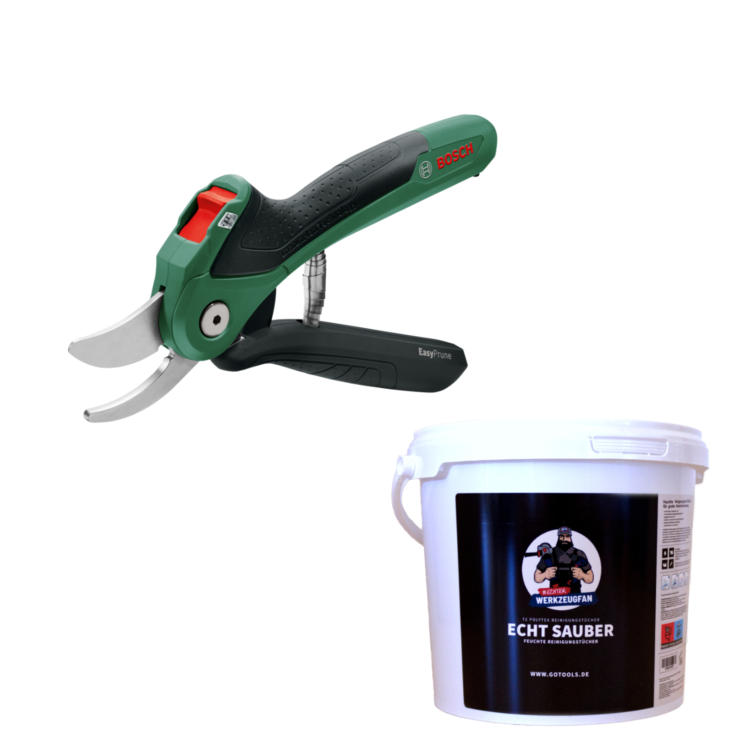 Technische Daten:Bosch Akku-Gartenschere EasyPrune:Werkzeugabmessungen (Länge): 250 mmWerkzeugabmessungen (Breite): 31 mmWerkzeugabmessungen (Höhe): 85 mmWerkzeugabmessungen (L x B x H): 250 x 31 x 85 mmSchwingungsemissionswert ah []: 2,5 m/s²Unsicherheit K []: 1,5 m/s²Akkuspannung: 3,6 VAkkuladezeit: 3,5 hAkkutyp: Lithium-IonenSchnittkapazität bis zu: 25 mmSchneidsystem: BypassSteckertyp: Micro-USBGewicht: 0,490 kgEchter Werkzeugfan Feuchte Polytex Reinigungstücher "ECHT SAUBER": Inhalt Eimer: 72 Stück Polytex ReinigungstücherAbmessung pro Tuch: 25x25 cmLieferumfang:1x Bosch Akku-Gartenschere EasyPrune1x Micro-USB-Kabel (1 607 000 CG9).1x Echter Werkzeugfan Feuchte Tücher 72 Stück - Echt Sauber EW.2279