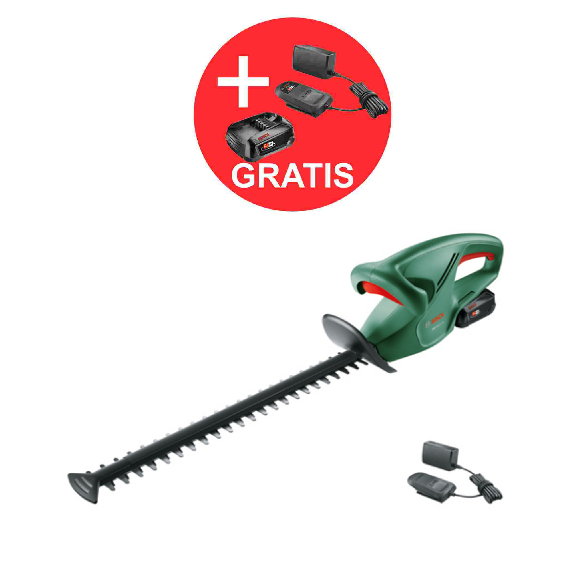 Produktbeschreibung: Akku-Heckenschere EasyHedgeCut 18-45. Einfaches und leichtes Schneiden mit optimaler Leistung. Bosch Anti-Blockier-System sorgt für unterbrechungsfreies Schneiden. Leichte Akku-Heckenschere (18V). Der 18V-Li-Ion-Akku POWER FOR ALL bietet optimale Leistung. 45 cm Messerlänge und 15 mm Zahnabstand für leichte Trimmarbeiten. Kabellose Mobilität für Bewegungsfreiheit im gesamten Garten.Technische Daten: Kompatibler Akku: 18V POWER FOR ALL ALLIANCE Akkutyp: Lithium-Ionen Arbeiten mit Akkukapazität: 2 Ah Akkuladezeit: 2 h Akkuladezeit: 124 min Hubzahl bei Leerlauf: 2.400 min-1 „Anti-Blockier-System“: nein 10,8 Volt: nein 12 Volt: nein 14,4 Volt: nein 18 Volt: nein 36 Volt: nein Lithium-Ionen Technologie: nein Quick-Cut-Technologie: nein Sägefunktion: nein Schwingungsemissionswert ah []: 2,5 m/s² Unsicherheit K []: 1,5 m/s² Akkuspannung: 18,0 V Akku-Empfehlung: >= 2,0 Ah Max. m² pro Akkuladung: 180 m² Messerlänge: 45 cm Messerabstand: 15 mm Lieferung ohne Akku und Ladegerät: nein Werkzeugabmessungen (L x B x H): 940 x 240 x 195 mm Gewicht: 2,700 Kg Gewicht exkl. Akku: 2,3 kgLieferumfang: 1x Bosch Akku-Heckenschere EasyHedgeCut 18-45 1x Akku PBA 18V 2.0Ah. 1x Ladegerät AL 1810 CV. 1x Messerabdeckung. 1x Bosch Starter-Set 18V Alliance: 1x 2,5 Ah und Ladegerät AL 18V-20 (1600A02625)