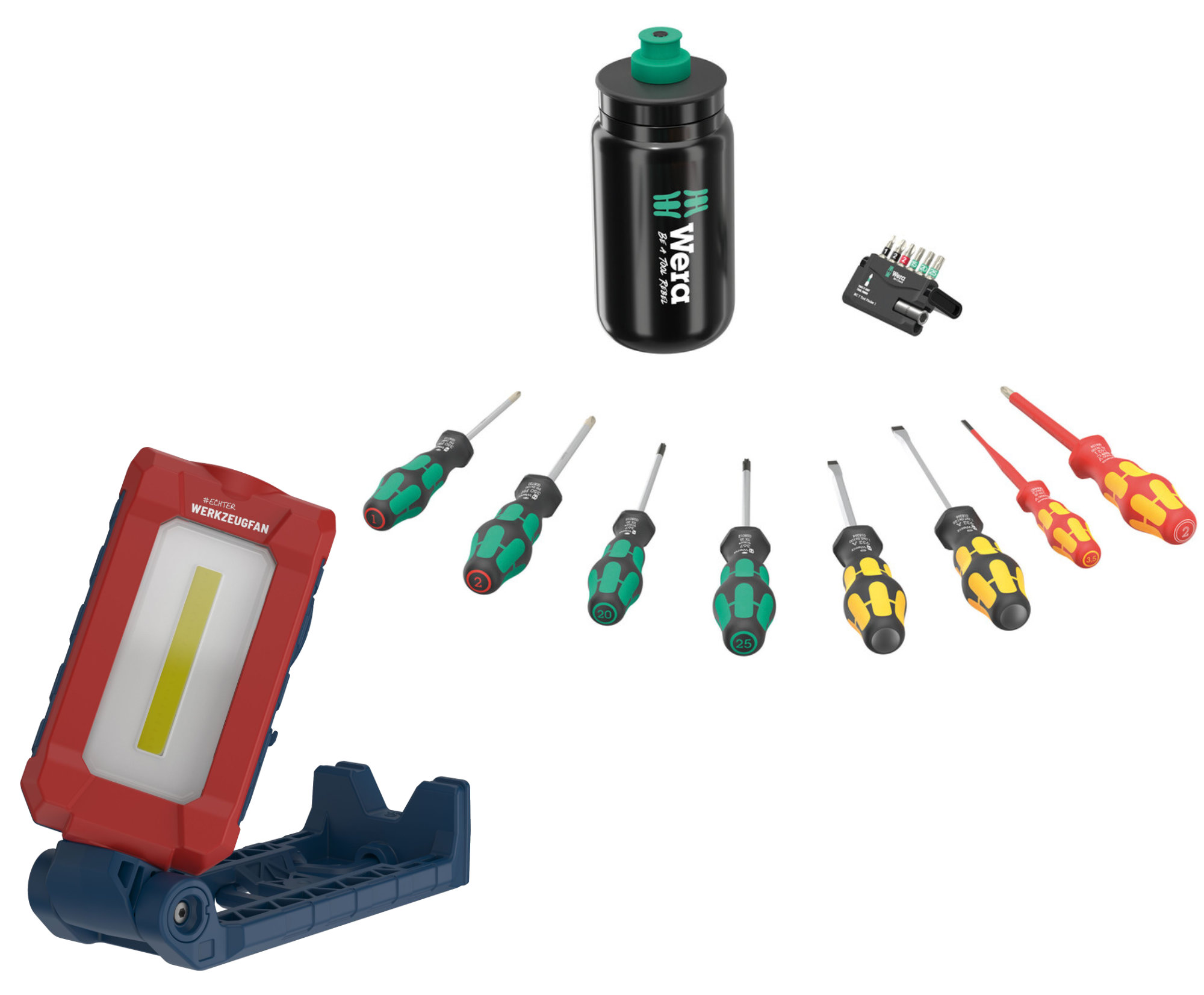 Wera Schraubwerkzeug Kraftform XL Bottle Set:1 x Trinkflasche Elite Fly 5501 x 1.0x5.5x100; 1 x 1.2x7.0x1251 x PH 1x80; 1 x PH 2x1001 x TX 20x100; 1 x TX 25x1001 x 0.6x3.5x100; 1 x PH 2x1001 x 1/4"x501 x PH 2x25; 1 x PZ 1x25; 1 x PZ 2x25; 1 x TX 15x25; 1 x TX 20x25; 1 x TX 25x25Lieferumfang:1x Echter Werkzeugfan Akku-Arbeitsleuchte Pocket 600R 360° drehbar1x USB Typ-C Ladekabel1x Wera Schraubwerkzeug-Set mit wiederbefüllbarer Trinkflasche Elite Fly Kraftform XL Bottle Set