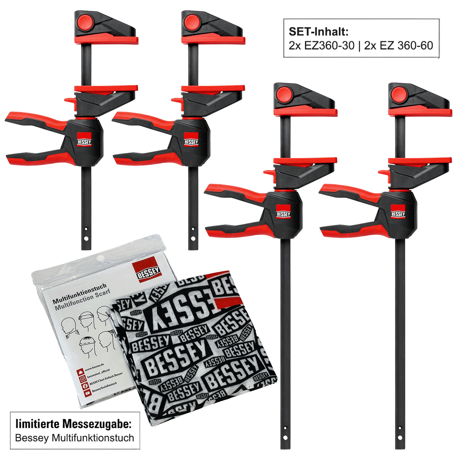 Lieferumfang: 2x Bessey Einhandzwinge mit drehbarem Griff EZ360-60 2x Bessey Einhandzwinge mit drehbarem Griff EZ360-30 1x extra Bessey Multifunktionstuch