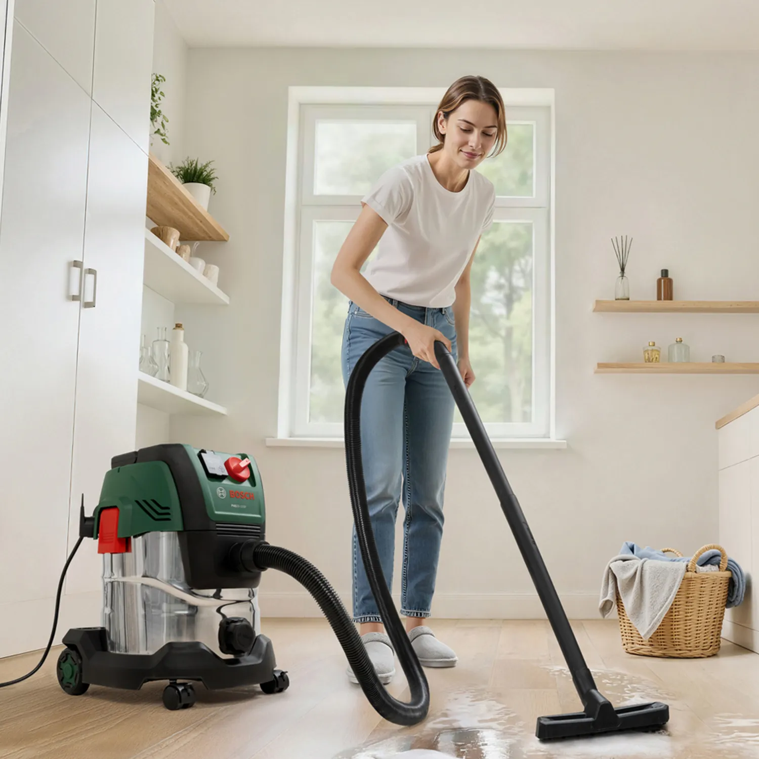 Der Bosch PAS20-220P ist für vielseitige Reinigungsaufgaben rund ums Haus konzipiert. Seine kompakte Bauweise trifft auf eine kräftige Saugleistung, mit der sowohl trockener Staub als auch feuchter Schmutz zuverlässig aufgenommen werden können – egal ob in der Werkstatt, im Keller oder in der Garage.
