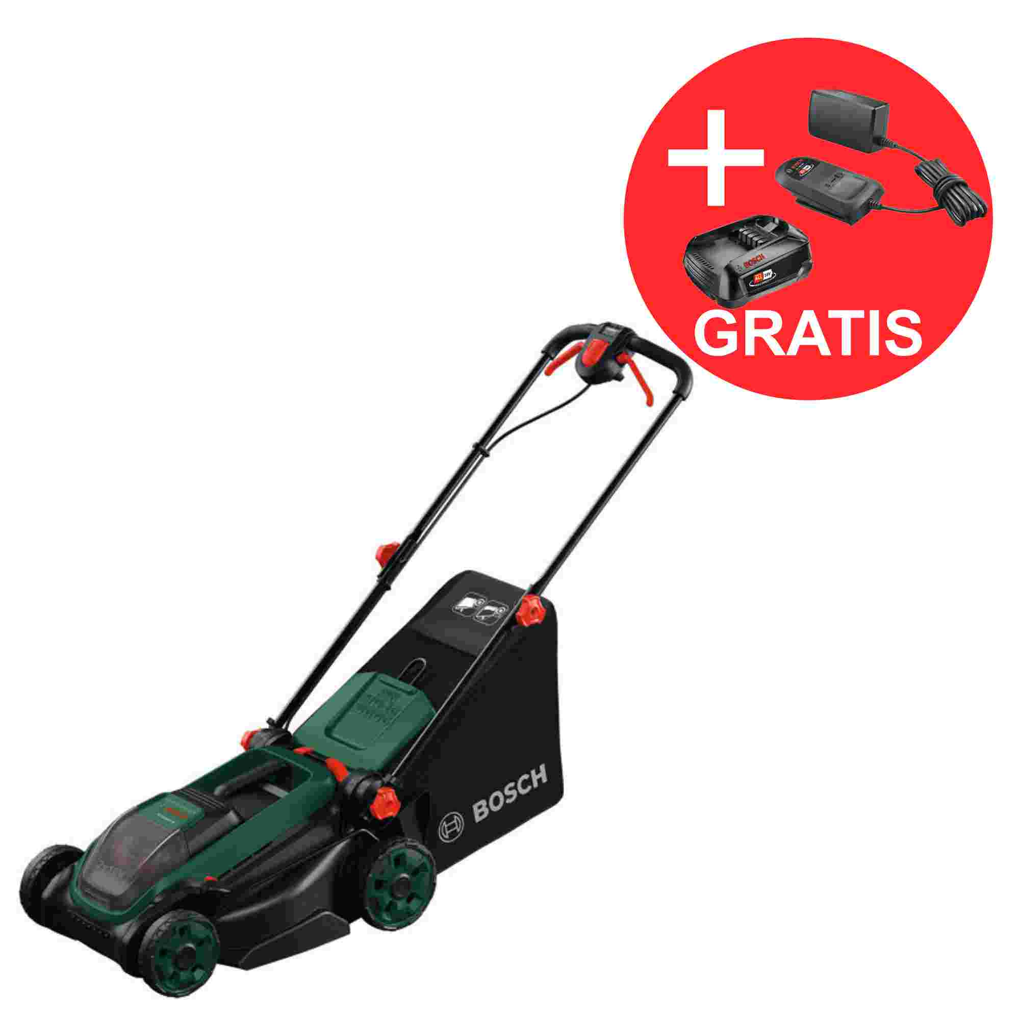 Produktbeschreibung: Akku-Rasenmäher ROTAK18V2-38. Kraftvoller 3-in-1-Mäher mit 38-cm-Messer für mittelgroße bis größere Rasenflächen. 2 x 18V-Akkus liefern die Kraft eines 36V-Systems und sorgen für eine längere Laufzeit. Bürstenloser Motor für hervorragende Leistung und eine längere Lebensdauer. Magnetisch gehaltenes Ablenkblech für die einhändige Entleerung des Grasfangkorbs. Klappbarer Griff und vertikale Lagerung für platzsparende Aufbewahrung. 6-stufige, zentrale Schnitthöhenverstellung (30-75 mm). Syneon-Technologie für optimale Laufzeit und Langlebigkeit des Werkzeugs. POWER FOR ALL ALLIANCE: 1 Akku, 10+ Marken, 150+ Produkte.Technische Daten: „Efficient Energy Management“: nein Rasenkamm: nein Integrierter Tragegriff: nein Ladezustandsanzeige: nein QuickClick: nein LeafCollect: nein Große 50-l-Fangbox: nein Große 43 cm Schnittbreite: nein Füllstandsanzeige: nein Im Set mit 2. Akku: nein Lieferung ohne Akku und Ladegerät: nein Werkzeugabmessungen (L x B x H): 1430 x 440 x 1060 mmLieferumfang: 1x Bosch Akku-Rasenmäher ROTAK 18V2-38 1x Bosch Starter-Set 18V Alliance: 1x 2,5 Ah und Ladegerät AL 18V-20 (1600A02625)