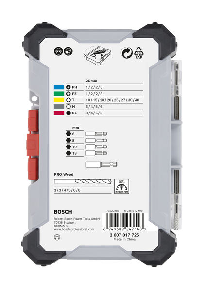 Produktbeschreibung: Das Extra Hard und PRO Wood Set, 35tlg. enthält alle Standardzubehörteile, die du für Schraubarbeiten und effektives Bohren in Hart und Weichholz benötigst. Die Schrauberbits bestehen aus wärmebehandeltem, S2-modifiziertem Stahl für Härte und Verschleißfestigkeit. Sie sind farbcodiert, damit du das richtige Bit einfacher findest. Die PRO Wood Holzspiralbohrer verfügen über eine Zentrierspitze, die ein Wandern vermeidet, wenn du ein neues Loch bohrst, und dich so beim präzisen Bohren unterstützt. Das Set ist in einem robusten Pick and Click-Koffer untergebracht, damit du deinen eigenen Werkzeugkasten zusammenstellen und deine Bits gut organisiert und geschützt aufbewahren kannst.Technische Daten: Abmessung: PH1 Länge mm: 25 Lieferumfang: 1x Bosch 35pcEH/Wo w/di