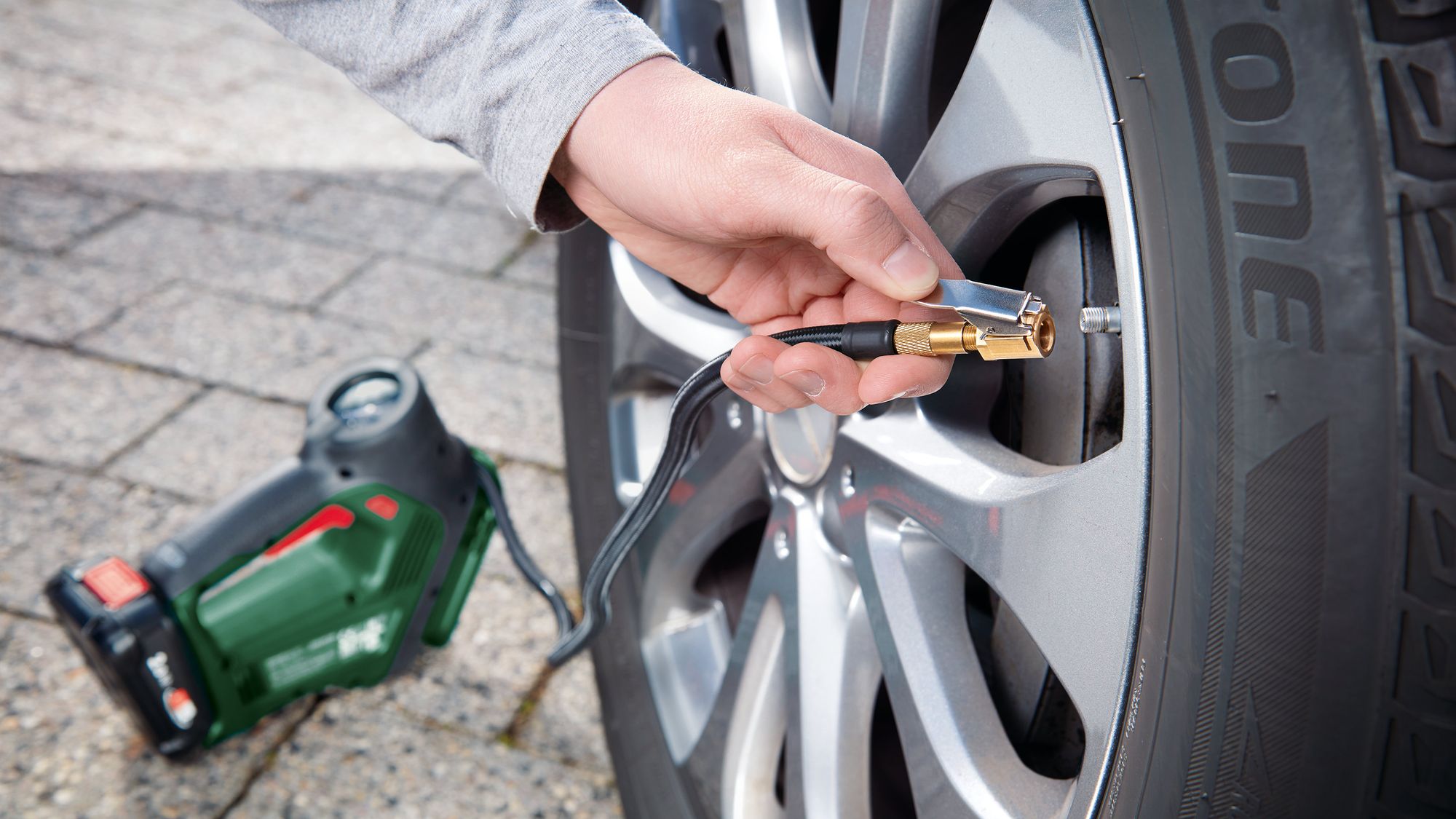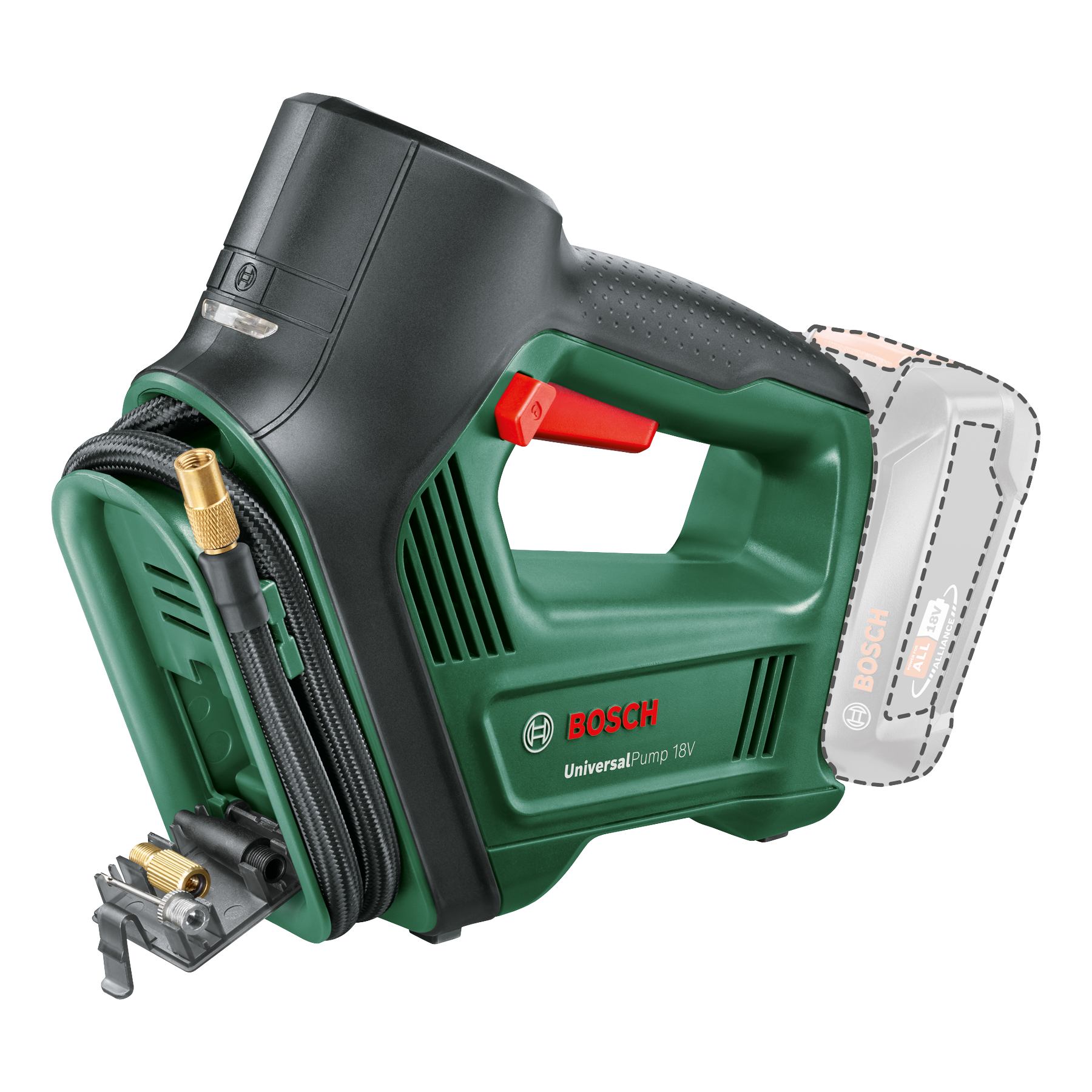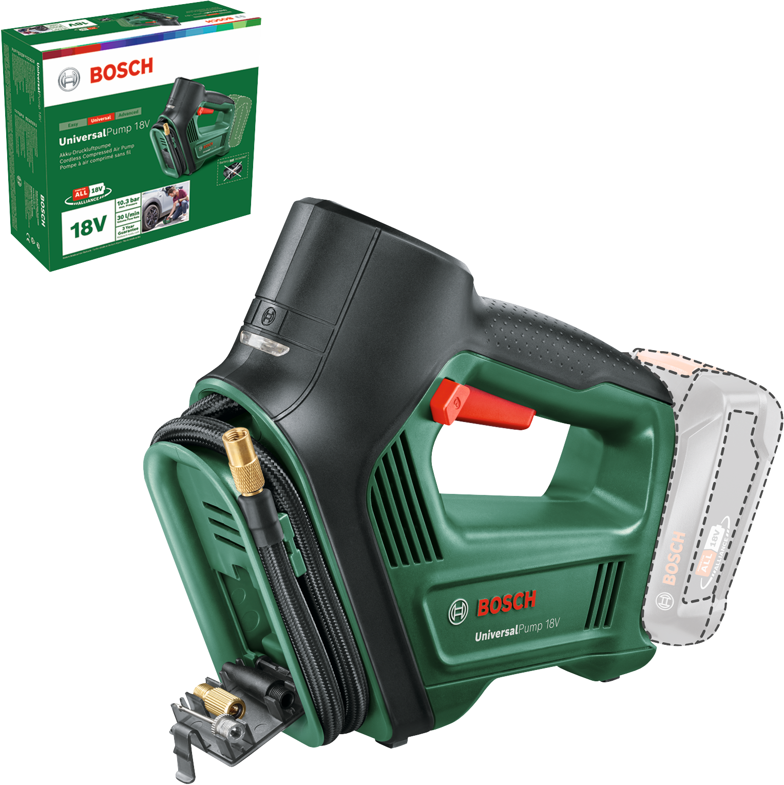 Produkteigenschaften: Akku-Druckluftpumpe UniversalPump 18V. Schnelles Aufpumpen von Auto-, Motorrad-, Wohnwagen- und Fahrradreifen. Schnelles Aufpumpen mit bis zu 30 l/min auf bis zu 10,3 bar. mit intuitiver Steuerung per Fingerdruck. Handliche, kompakte Pumpe mit unterbrechungsfreier Messung über ein beleuchtetes Manometer. Aufbewahrung direkt am Werkzeug: Verschiedene Adapter sind ordentlich an der Werkzeugvorderseite verstaut. Pumpt größere Gegenstände auf, die einen hohen Druck erfordern (wie Reifen und Bälle). Beleuchteter Ventilbereich und Akkustatusanzeige. Französisches Ventil. Ballnadel. Volumenadapter. Karton Aufbewahrung direkt am Werkzeug: Verschiedene Adapter sind ordentlich an der Werkzeugvorderseite verstaut Beleuchteter Ventilbereich und Akkustatusanzeige Handliche, kompakte Pumpe mit unterbrechungsfreier Messung über ein beleuchtetes Manometer Pumpt größere Gegenstände auf, die einen hohen Druck erfordern (wie Reifen und Bälle) Schnelles Aufpumpen mit bis zu 30 l/min auf bis zu 10,3 bar; mit intuitiver Steuerung per Fingerdruck