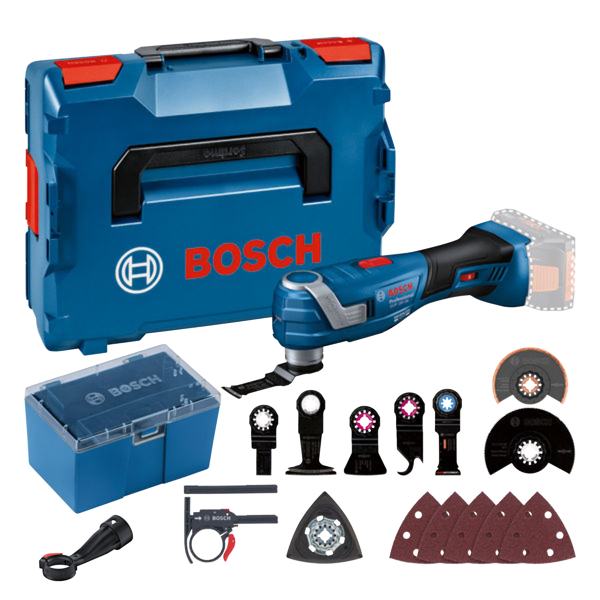 Produktbeschreibung:Komfortabler Allrounder: oszillierendes Multifunktionswerkzeug mit Starlock Plus und Vibration ControlBefestigen und Lösen aller Zubehöre mit Werkzeugaufnahme Starlock PLUS – das bietet der 18V-Multicutter GOP 18V-34 mit einem 3,4 Grad OszillationswinkelSnap-In: Messerwechsel in Sekundenschnelle – keine weiteren Werkzeuge erforderlich und kein Risiko, den Befestigungsstift zu verlierenVibration Control: reduziert deutlich die Vibrationen (50 % weniger als beim Vorgänger) für ermüdungsärmeres ArbeitenSchmaler Griff mit einem Durchmesser von 180 mm: verbessert die Werkzeugkontrolle und sorgt für maximalen Komfort bei der ArbeitTechnische Daten:Akkuspannung: 18.0 VLeerlaufrotation, bis zu: 20000 min-1Leerlaufschwingzahl: 20000 min-1Oszillationswinkel links und rechts: 1.7 °Gewicht exkl. Akku: 1.2 kgSchwingungsemissionswert ah [Sägen mit Tauchsägeblatt]: 3.9 m/s²Unsicherheit K [Sägen mit Tauchsägeblatt]: 1.5 m/s²Schwingungsemissionswert ah [Sägen mit Segmentsägeblatt]: 3.0 m/s²Unsicherheit K [Sägen mit Segmentsägeblatt]: 1.5 m/s²Lieferumfang:1x Bosch Akku-Multi-Cutter GOP 18V-341x StarlockPlus BIM Tauchsägeblatt PAIZ 32 APB1x Curved-Tec, Wood + Metal (2 608 662 558)1x Starlock Plus Metal Max Tauchsägeblatt PAIZ 32 AIT, Metal (2 608 900 019)1x Starlock BIM Tauchsägeblatt AIZ 20 AB, Wood + Metal (2 608 661 640)1x StarlockPlus BIM Tauchsägeblatt PAII 65 APB, Curved-Tec, Wood + Metal (2 608 662 564)1x Starlock BIM Segementsägeblatt ACZ 100 BB, Wood + Metal (2 608 661 633)1x Starlock Carbide-RIFF Segementsägeblatt ACZ 85 RT3, Grout + Abrasive (2 608 661 642)1x Starlock Deltaschleifplatte AVZ 93 G (2 608 000 493)5x Schleifblätter, K 2x80, 2x120, 1x240 (2 608 621 104)1x Starlock HCS Schaber ATZ 52 SC, starr, Multi Material (2 608 661 646)1x Starlock ASZ 32 SC HCS-Multiblatt, Multi Material (2 608 662 431)1x Starlock Tiefenmesser Expert (2 608 000 590)1x Starlock Absaugadapter mit Spannhals (2 608 000 636)1x kleine, blaue Box für Starlock-Zubehör1x L-BOXX 136 (1 600 A01 2G0)