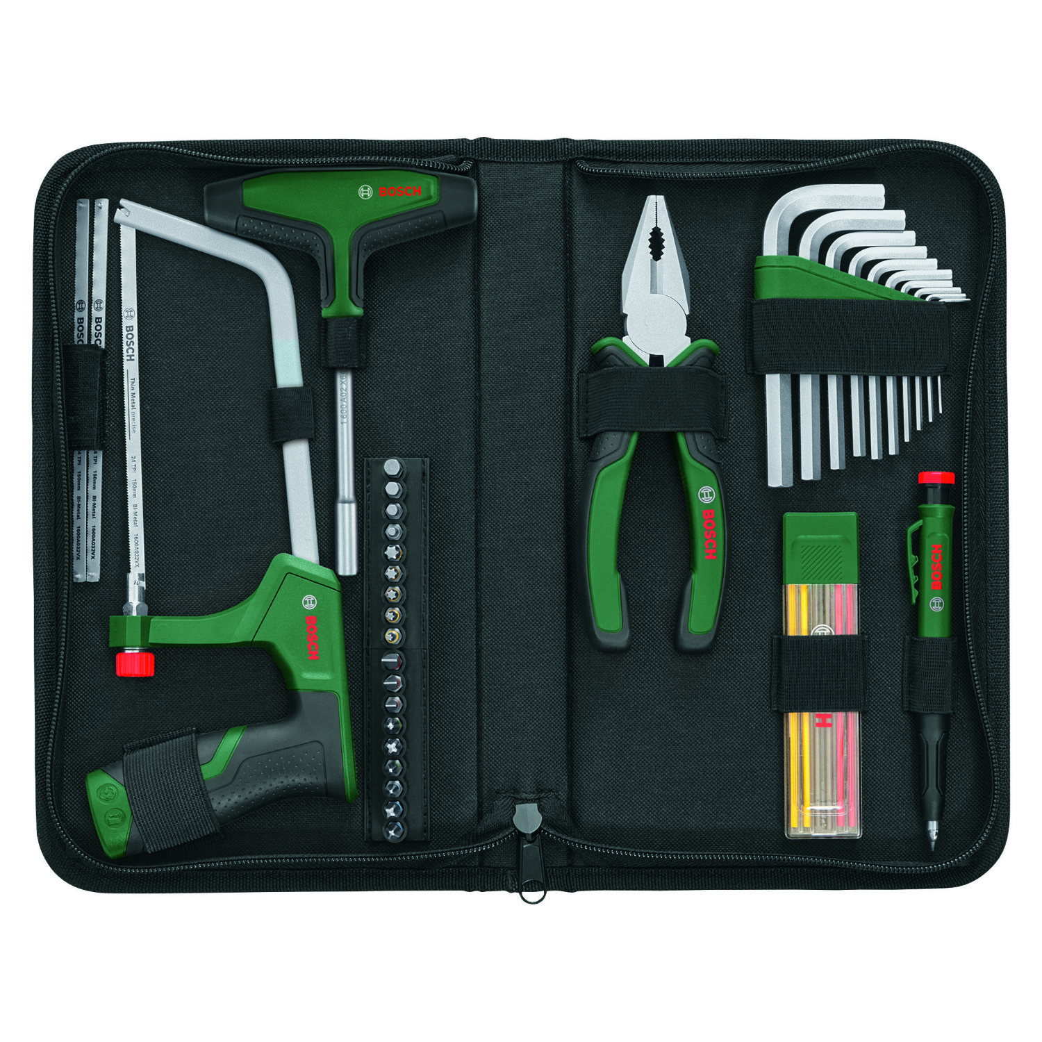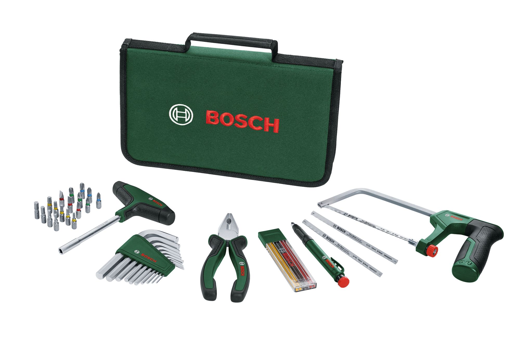 Produkteigenschaften:Bosch Werkzeug-Set, bestehend aus dem Adventskalender 2025 und dem VDE Handwerkzeug-Set:Bosch Home and Garden Werkzeug-Adventskalender 2025 – 41-teiliges Set für HeimwerkerDer Bosch Werkzeug-Adventskalender 2025 ist das perfekte Geschenk für alle DIY-Fans und Heimwerker, die sich in der Vorweihnachtszeit über hochwertige Überraschungen freuen möchten. Hinter jedem der 24 Türchen steckt ein praktisches Werkzeug aus dem 41-teiligen Set – von Bits über Inbusschlüssel bis hin zu einer kompakten Bügelsäge. Dieses Advents-Highlight ist eine optimale Wahl für alle, die einen Werkzeug Adventskalender kaufen möchten, der nicht nur Freude macht, sondern auch nachhaltig nützlich ist.Warum dieser Adventskalender perfekt istIdeales Heimwerker Geschenk: Ein einzigartiger Adventskalender für alle, die gern schrauben, sägen und bauen.41 hochwertige Teile: Inklusive Bit-Schraubendreher, Kombizange, Bügelsäge, Inbusschlüssel, Markierstift und vielem mehr.Bosch Qualität: Robuste Verarbeitung und ergonomisches Design für komfortables und präzises Arbeiten.Praktische Aufbewahrung: Alle Teile kommen in einer stabilen Stofftasche mit Reißverschluss – perfekt für Werkstatt, Garage oder unterwegs.DIY-Adventskalender: Ein Must-have für Heimwerker und alle, die praktische Überraschungen lieben.Technische Daten:1x Bit-Schraubendreher mit T-Griff + 18 Bits (PH, PZ, SL, Torx, HEX)1x Kombizange (180 mm)1x Bügelsäge (150 mm) + 2x Ersatz-Sägeblätter1x Tiefloch-Markierstift inkl. Graphitmine10x Inbusschlüssel (1.5–10 mm) im Organizer6x mehrfarbige Minen (rot, gelb, grau) im Etui1x Stofftasche mit Reißverschluss (180 x 300 x 45 mm)1x VDE-abisolierter PH-Schraubendreher1x VDE-diagonaler Seitenschneider (160 mm)1x Original Bosch Flaschenöffner