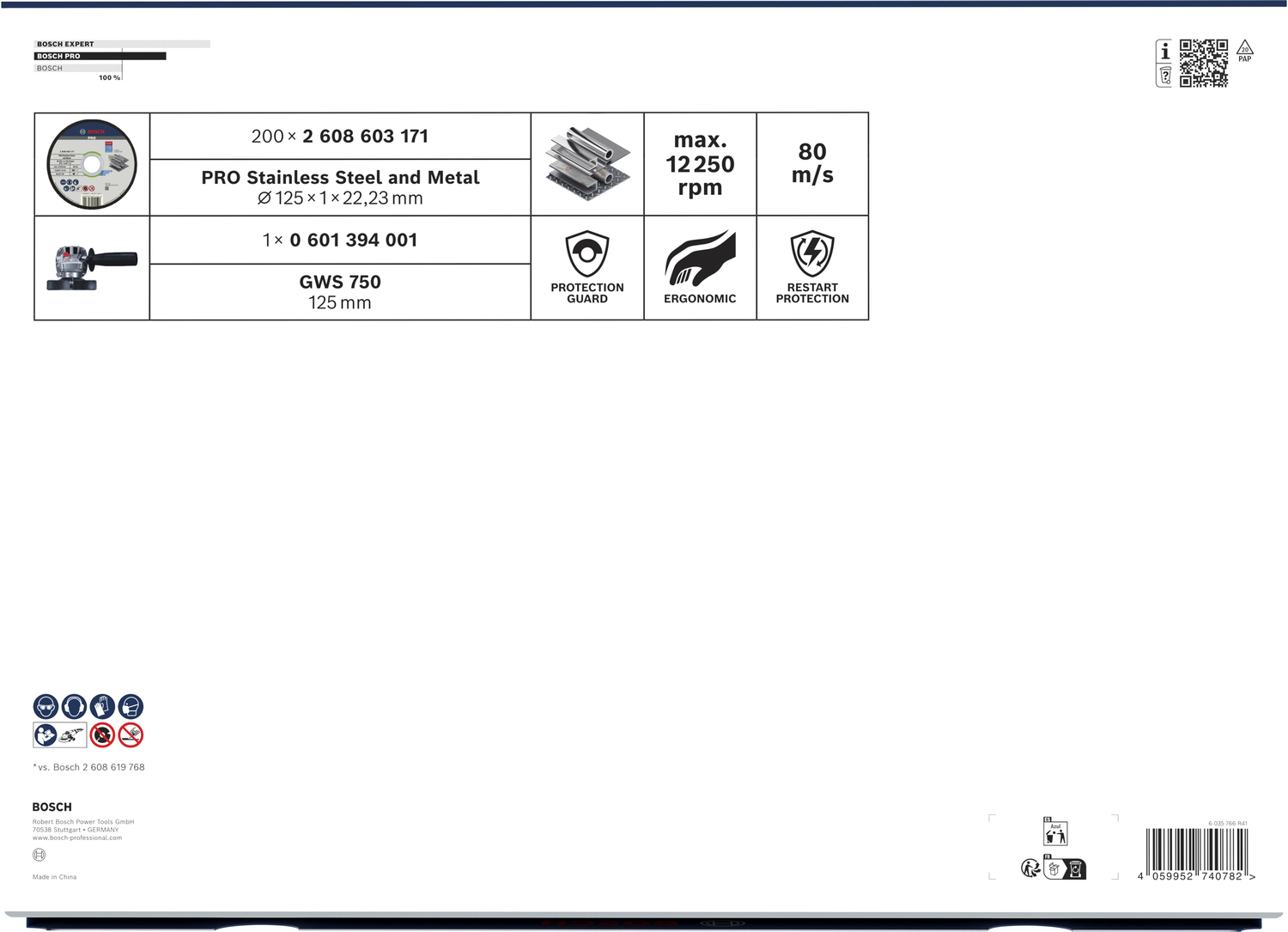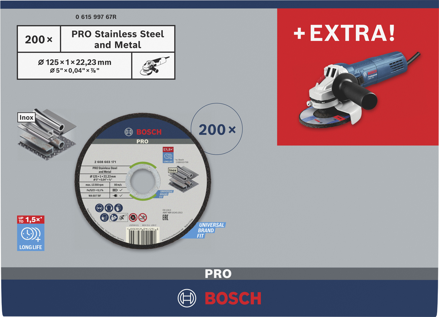 Unsicherheit K1,5 m/s²Lieferumfang:200 x Bosch PRO INOX+Metal TS,125x1x22.23 mm,gerade (2608603171)1 x Bosch Winkelschleifer GWS 750 125 mm (0601394001)