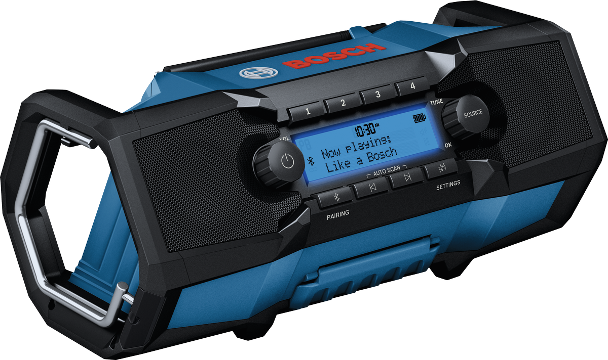 Produkteigenschaften: Das PRO GPB18V-3SC liefert den perfekten Soundtrack für einen angenehmen Arbeitstag Es funktioniert mit DAB+, Bluetooth®, FM und Multi-Speaker Sound, mit dem du Musik-Streams auf mehreren kompatiblen Geräten über Bluetooth® teilen und verbinden kannst Es ist einfach zu bedienen, bietet Aufladen über USB-C® und Schutzart IP54, wenn die Akkuabdeckung und alle Fächer geschlossen sind Dieses kompakte Radio ist senkrecht oder waagerecht aufstellbar und verfügt sowohl über einen Griff als auch einen Haken für einfachen Transport und praktische Aufbewahrung Kompatibel mit dem Bosch Professional 18V System und dem markenübergreifenden Akkusystem AMPShare. Das Radio kann mit einem USB-C®-Netzteil mit Power Delivery (PD) betrieben werden.