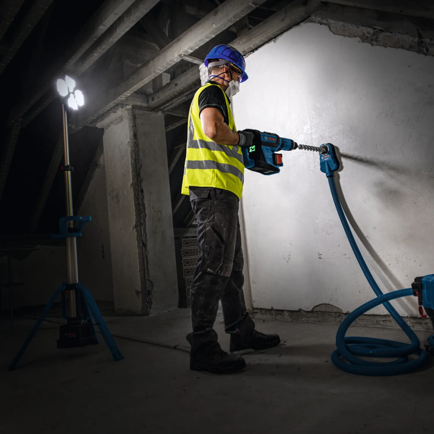 Die PRO GLT 18V-5000 Professional eignet sich zur Ausleuchtung mittelgroßer bis großer Arbeitsbereiche auf Baustellen, in Werkstätten oder bei Montagearbeiten. Sie ist kompatibel mit dem Bosch Professional 18V System sowie der markenübergreifenden AMPShare Akku-Allianz.