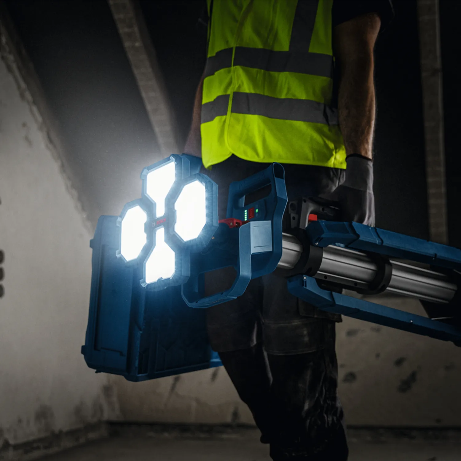 - Leistungsstarke Arbeitsausleuchtung mit bis zu 5.000 Lumen dank 80 hocheffizienter LEDs – ideal für große Baustellen und Werkstätten.