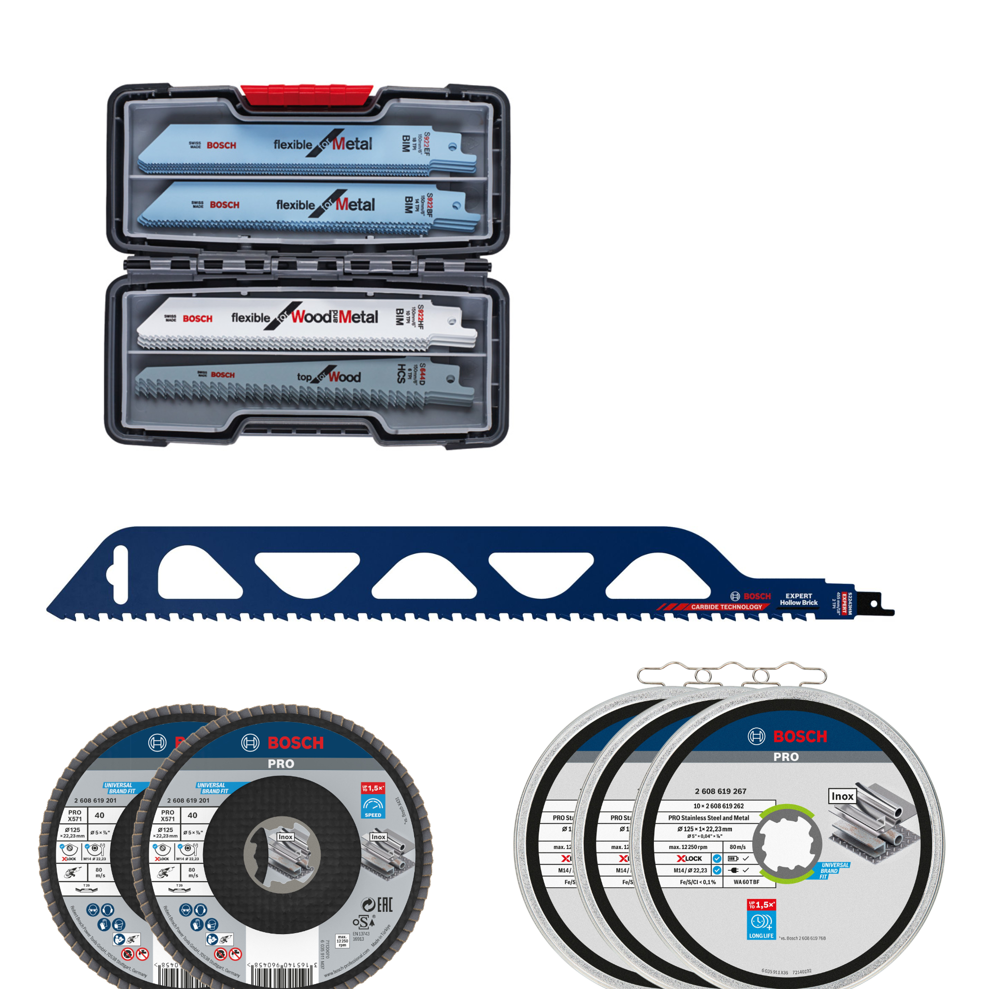 Lieferumfang:2x Bosch PRO X571 X-Lock Fächerschleifscheibe, 125 mm, G40, gewinkelt, Glasfaser3x Bosch PRO Stainless Steel and Metal X-Lock Trennscheibe, 125 x 1 x 22.23 mm, gerade, 10 Stück1x Bosch EXPERT ‘Hollow Brick’ S 2243 HM Säbelsägeblatt, 1 Stück1x Bosch Säbelsägeblatt-Set Wood and Metal 20-teilig (2607010902)