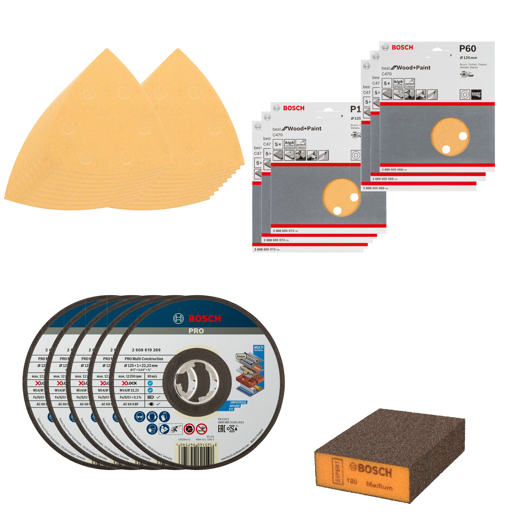 Technische Daten:Abmessungen mm: 69 x 97 x 26Feinheitsgrad: mittelProduktfarbe: orangeProdukteigenschaften:Das Schleifblatt C470 Best for Wood besitzt eine überragende Materialabtragsrate.Das Produkt besitzt eine Calciumstearatbeschichtung, die ein Verstopfen des Blattes verhindert.Die Oberfläche mit elektrostatisch offen gestreuten Schleifkörnern mit definierten Zwischenräumen ermöglicht eine gleichmäßige Staubabsaugung.Damit eignet sich das Blatt für das Schleifen von Holz, Farbe, Lack, Rauputz, Füllstoffe und Kunststoffe sowie harte Materialien wie Polymere (Corian, Varicor).Das Produkt besteht aus C-/B-Papier und ist mit Schleifkörnern aus Halbedelkorund besetzt.Damit erzielt es eine gleichmäßig hohe Oberflächenqualität.Das Schleifblatt lässt sich mit dem Klettverschlusssystem schnell und einfach handhaben, wechseln und fixieren.Das Schleifblatt C470 Best for Wood eignet sich für Dreieckschleifer und Multifunktionswerkzeuge.Technische Daten:Blattabmessung mm: 93x93Körnung: 80Lochung: 8 LöcherPasst zu: GOP 12V-LI (060185800V), GOP 250 CE (0601230000)Produkteigenschaften:Das Schleifblatt C470 Best for Wood besitzt eine überragende Materialabtragsrate.Das Produkt besitzt eine Calciumstearatbeschichtung, die ein Verstopfen des Blattes verhindert.Die Oberfläche mit elektrostatisch offen gestreuten Schleifkörnern mit definierten Zwischenräumen ermöglicht eine gleichmäßige Staubabsaugung.Damit eignet sich das Blatt für das Schleifen von Holz, Farbe, Lack, Rauputz, Füllstoffe und Kunststoffe sowie harte Materialien wie Polymere (Corian, Varicor).Das Produkt besteht aus C-/B-Papier und ist mit Schleifkörnern aus Halbedelkorund besetzt.Damit erzielt es eine gleichmäßig hohe Oberflächenqualität.Das Schleifblatt lässt sich mit dem Klettverschlusssystem schnell und einfach handhaben, wechseln und fixieren.Das Schleifblatt C470 Best for Wood eignet sich für Exzenterschleifer.Technische Daten:Scheibendurchmesser mm: 125Körnung: 120Lochung: 8 LöcherLieferumfang:1x Bosch EXPERT S471 Standard Schleifblock, 26×69×97 mm, mittel5x Bosch PRO Multi Material X-Lock Trennscheibe, 125 x 1 x 22,23 mm3x Schleifblatt C470 für Exzenterschleifer, 125 mm, 120, 8 Löcher, Klett, 5er-Pack5x Schleifblatt C470 für Deltaschleifer, 93 mm, 80, 6 Löcher, Klett, 5er-Pack3x Schleifblatt C470 für Exzenterschleifer, 125 mm, 60, 8 Löcher, Klett, 5er-Pack