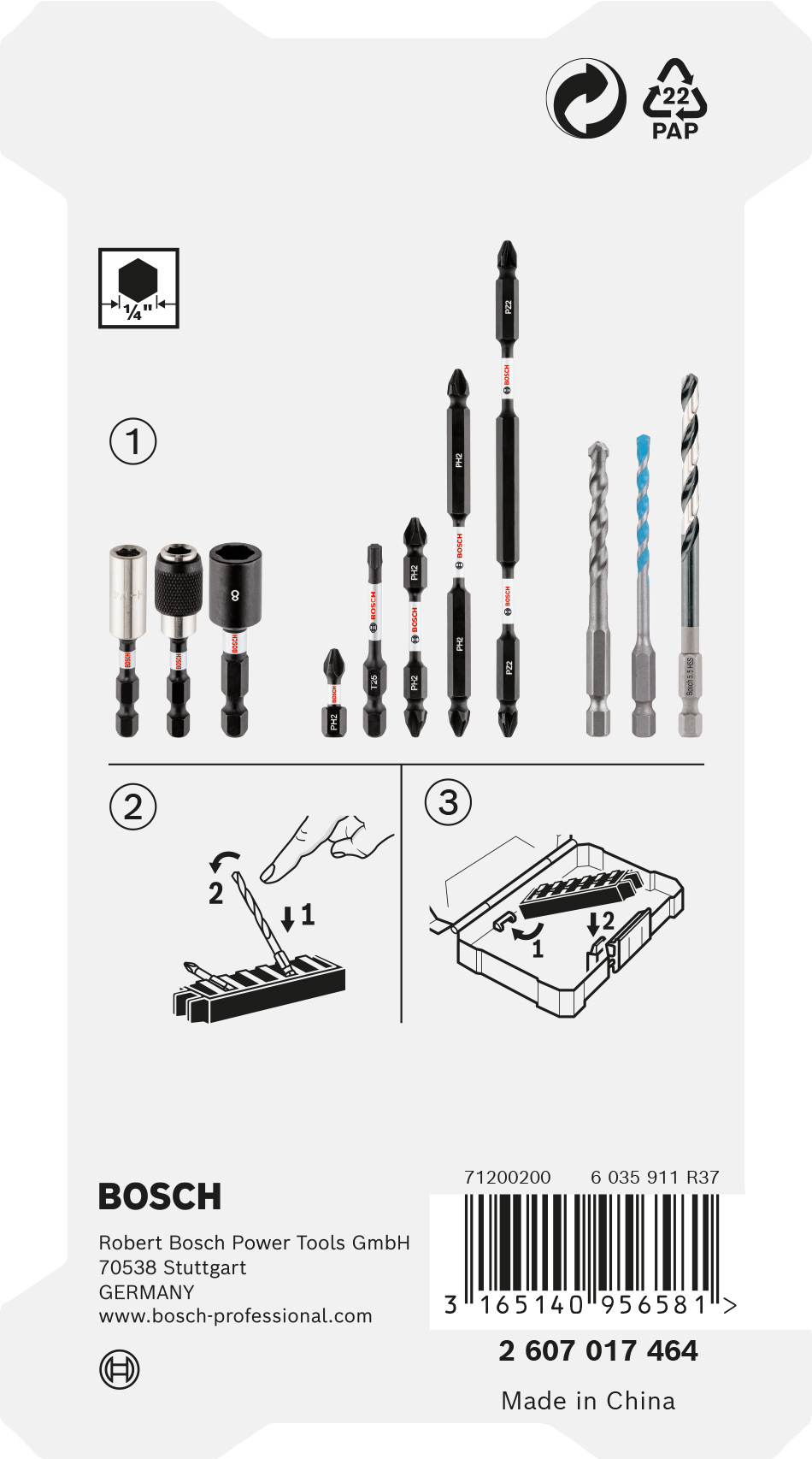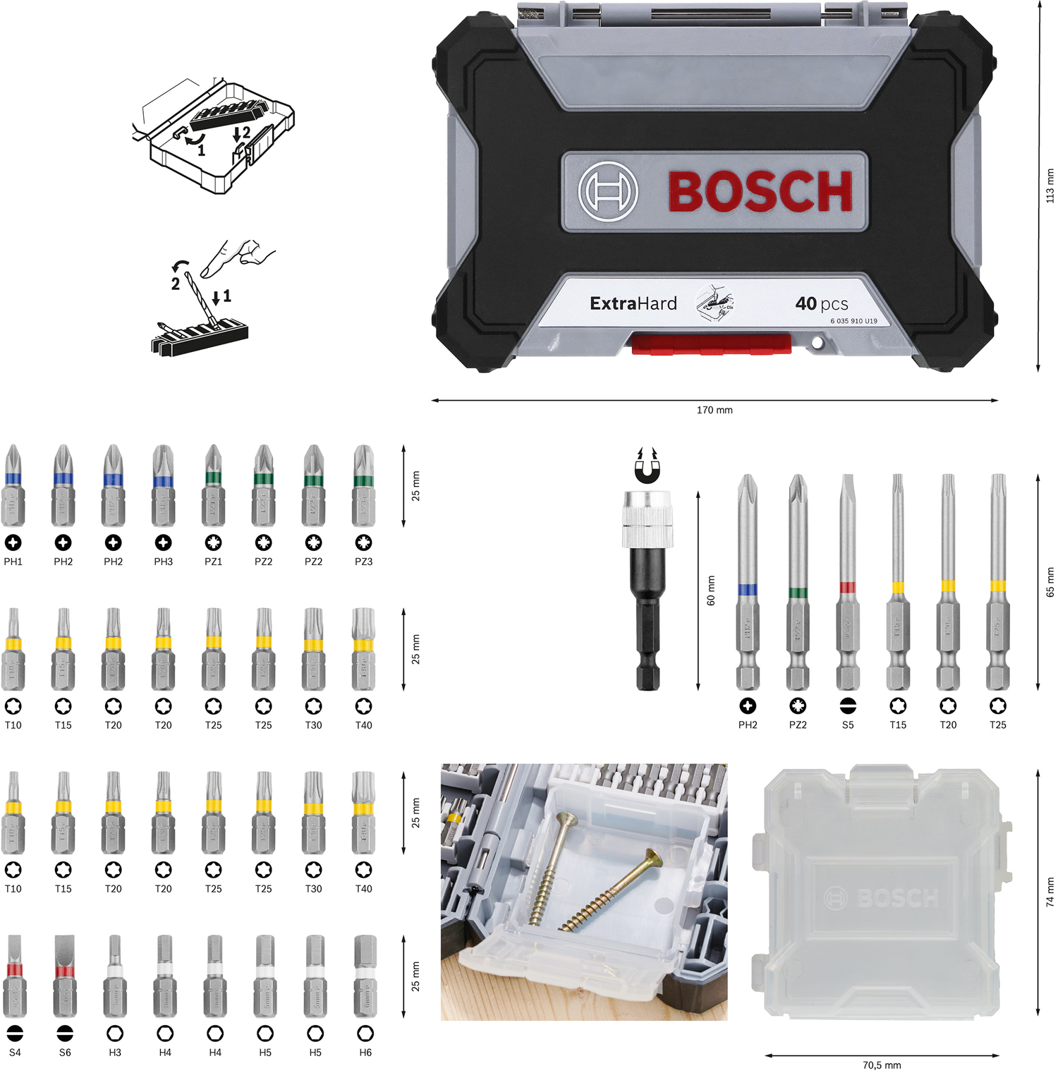 Lieferumfang:1x Bosch Pick and Click-Schrauberbit-Set Extra Hard mit Universalhalter 40-teilig