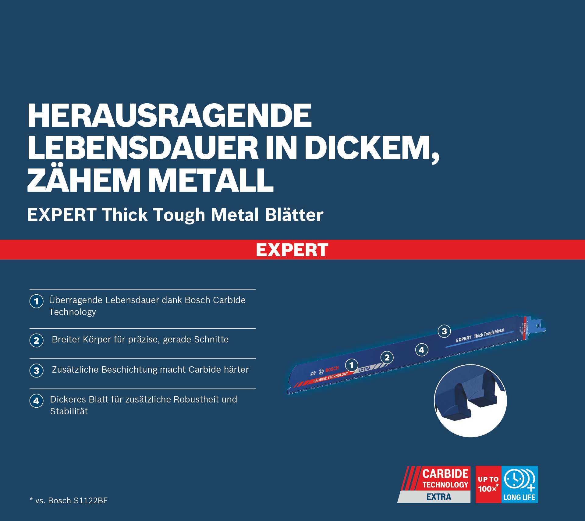 Hält bis zu 100-mal länger als ein Bosch S1122BF Blatt in zähen Materialen