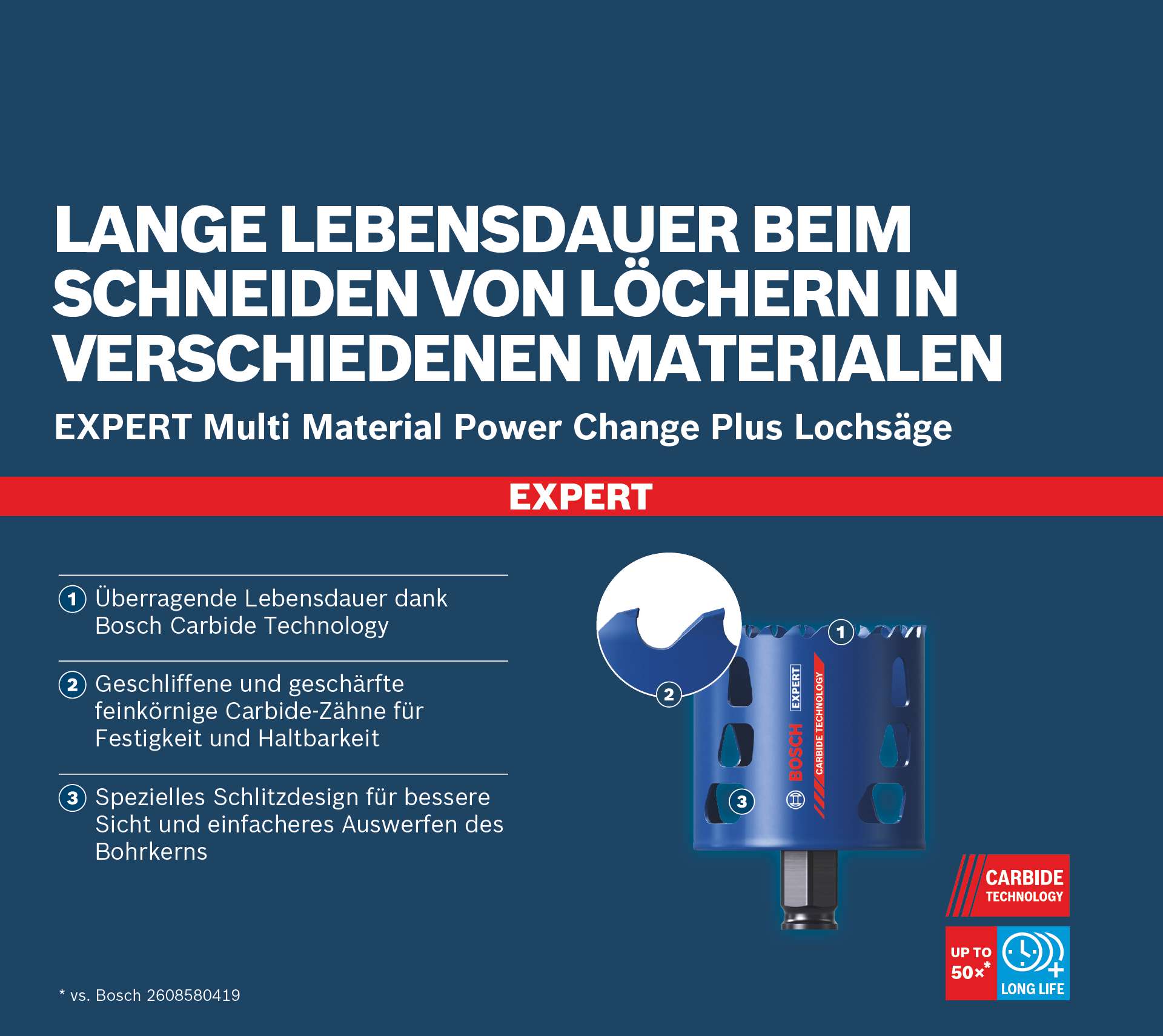 Jeder mit der Bosch Carbide Technology (Bosch Carbide-Technologie) hergestellte Zahn hat eine optimale Qualität des härtesten Metalls. Er wird sechsmal lasergeschweißt und geschliffen, um die perfekte Schnittform zu erzielen. Damit ist die Bosch EXPERT Multi Material PC Plus Lochsäge ideal für schwere Bearbeitung und Allround-Arbeiten: Neben Holz und Metall kann die Lochsäge auch gut für Edelstahl, Ziegelstein, weiche Fliesen und verstärkte Kunststoffe eingesetzt werden.