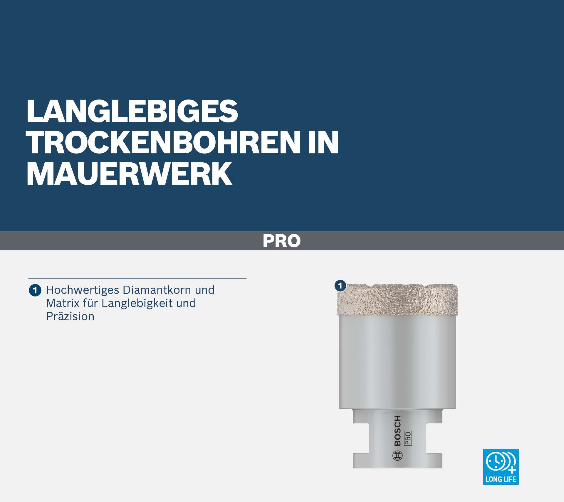 Die Qualität und Haltbarkeit des PRO Core Cutter dry zeigt sich in seinem hochwertigen Diamantbesatz in einer Premium-Metallmatrix - für hohe Leistung und Langlebigkeit.