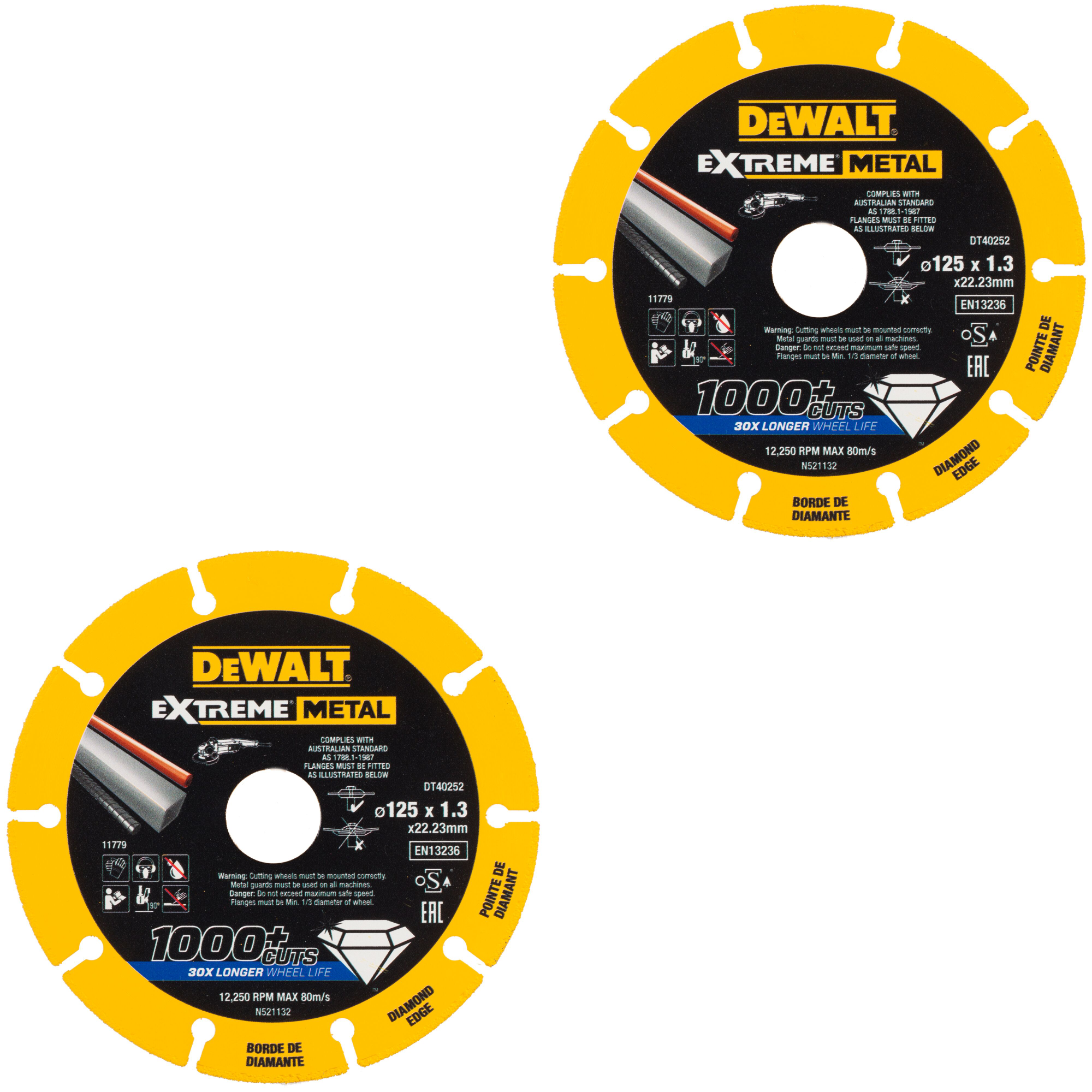 Deutschland 06126/211 DeWALT Diamanttrennscheibe-Doppelpack 125 x 1,3 mm EXTREME METAL Artikel-Nr.: 2xDT40252 EAN: 4250845568272 Hersteller: DEWALT