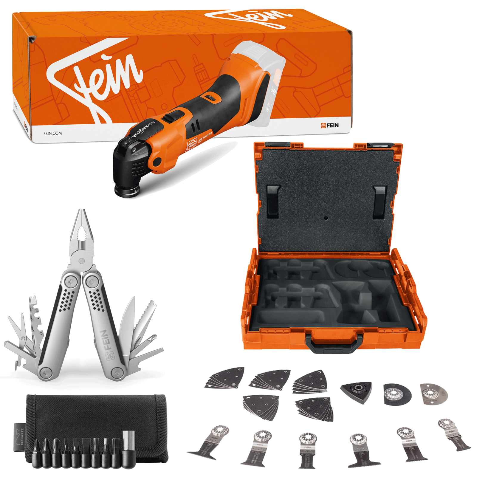 Lieferumfang:1x Fein Akku MultiMaster AMM 500 PLUS AS(ohne Akku und Ladegerät)1x Fein Multitool STRUKTURA tool 25+1x Bit-Set mit Bit-Adapter und 9 Bits1x Tasche1x Fein Starlock Zubehör L-BOXX 102, 34 tlg.