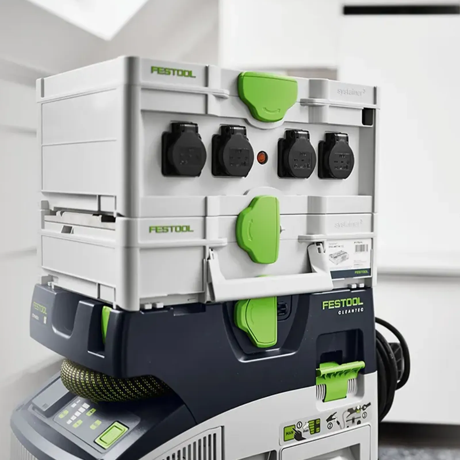 Schluss mit Kabelsalat und Mehrfachsteckdosen: Der Festool SYS3 PowerHub kombiniert Kabeltrommel und Systainer-System in einer Lösung. 10 Meter Kabel, vier Steckdosen außen und zusätzlicher Stauraum im Inneren – alles sauber organisiert und jederzeit griffbereit.