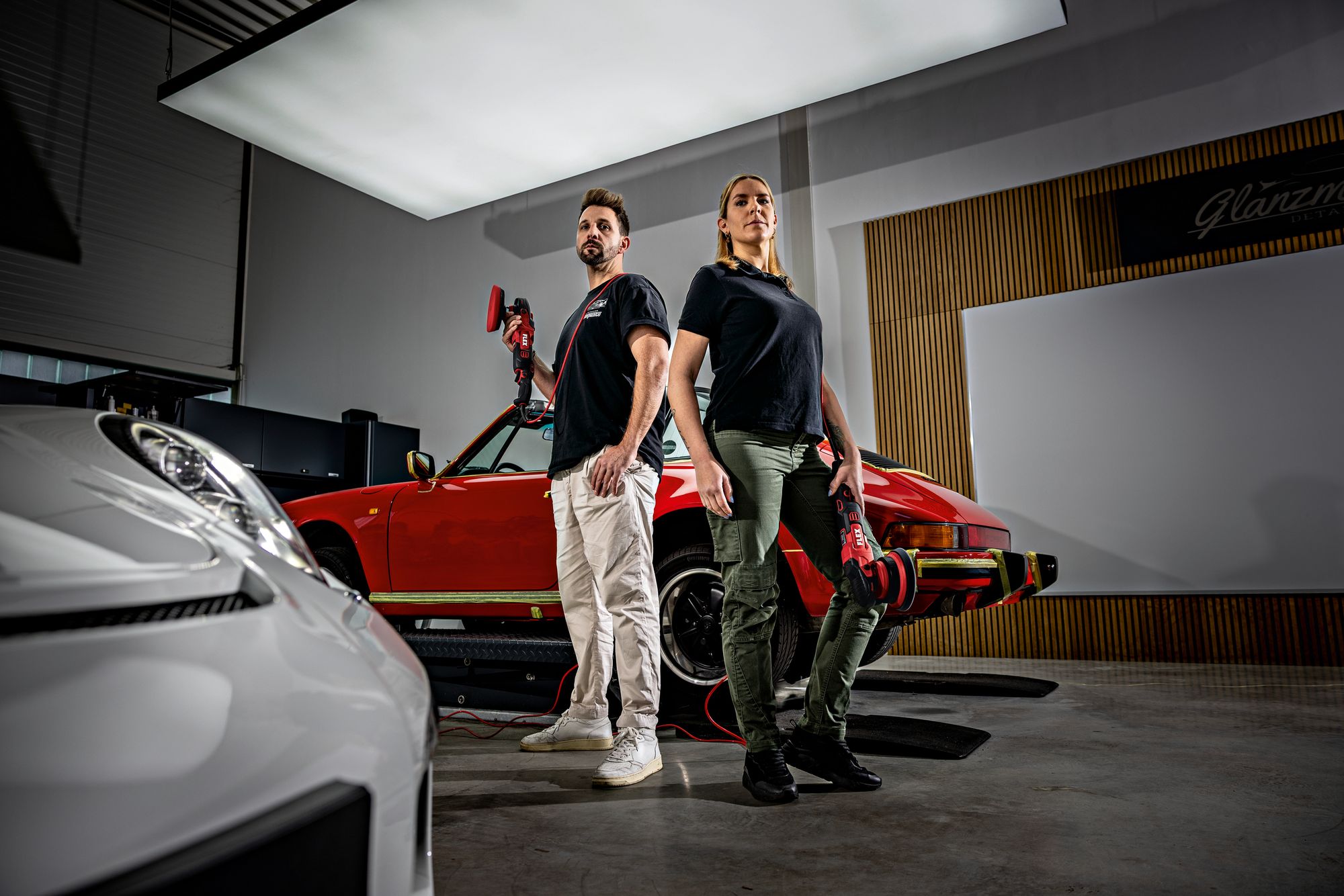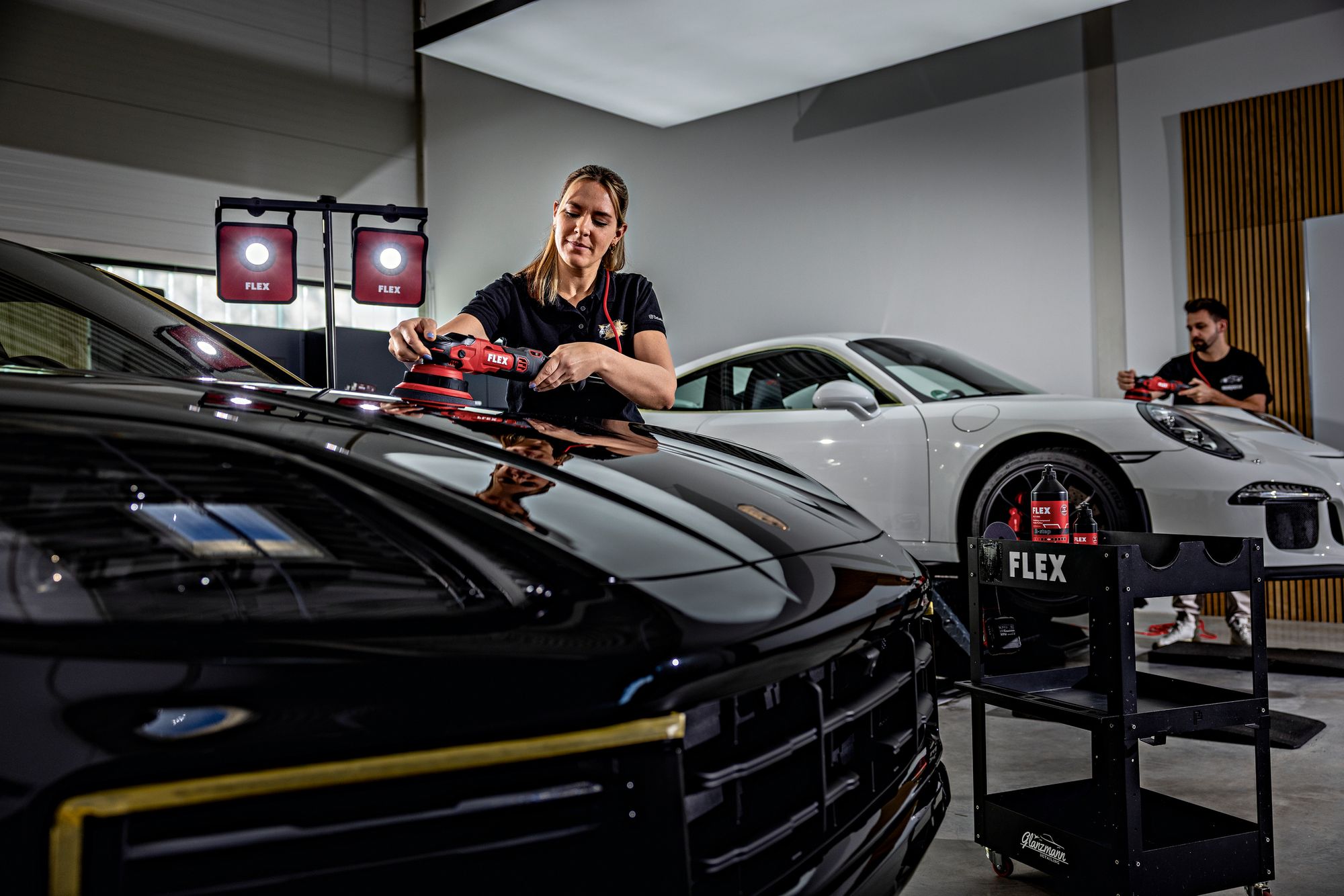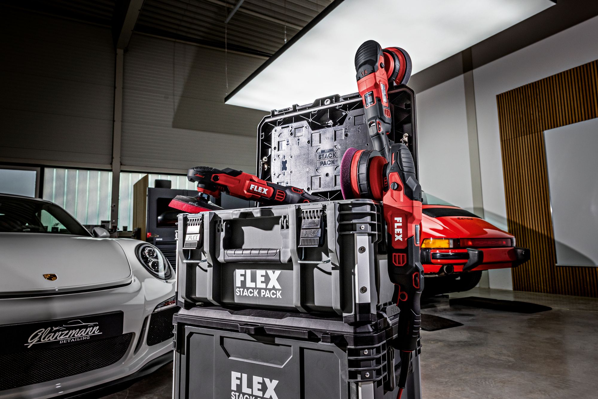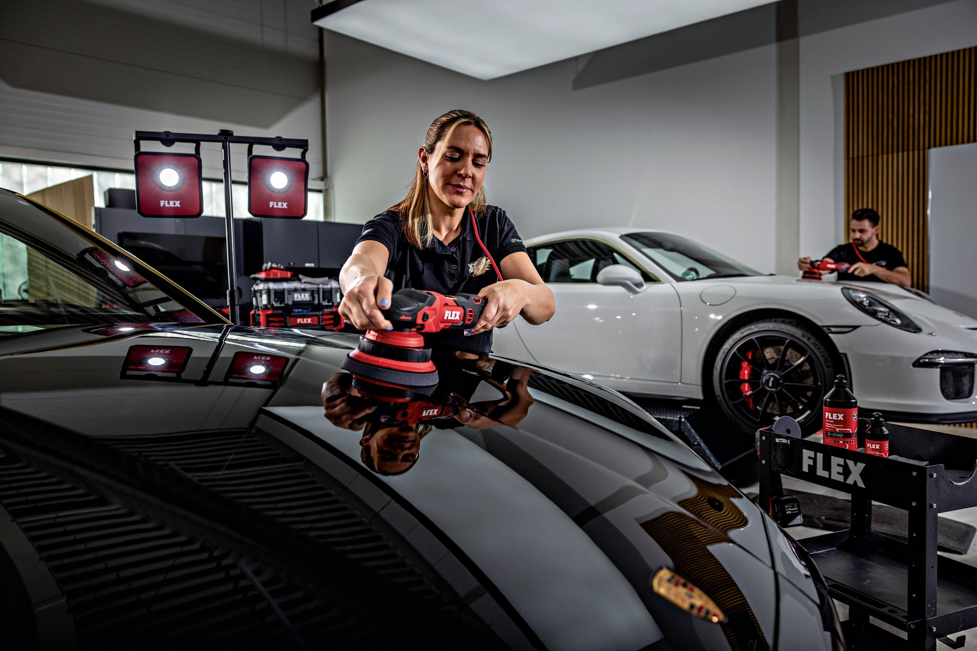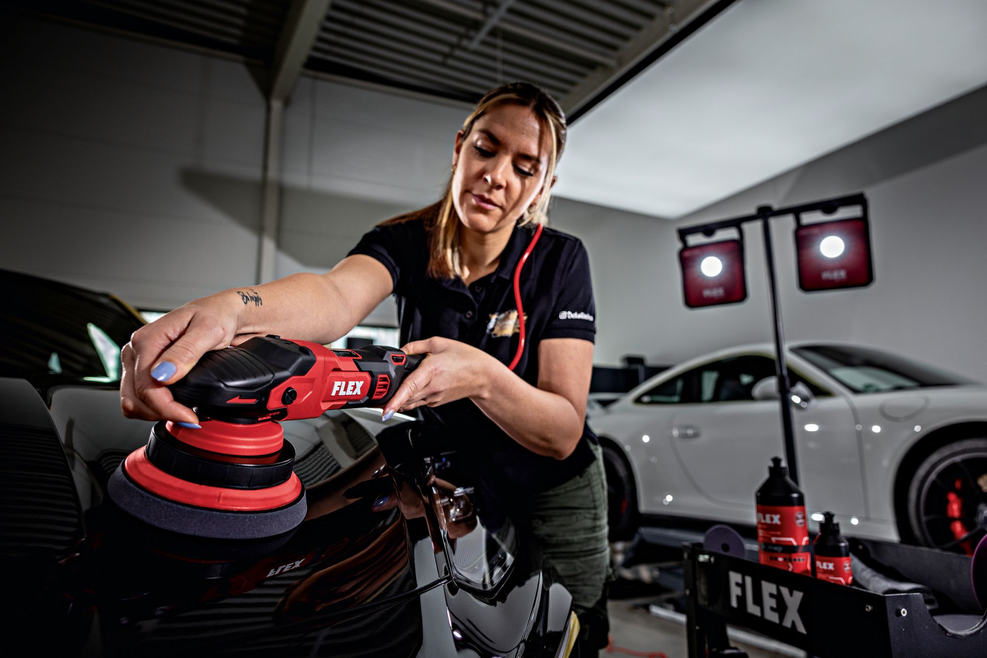 Produkteigenschaften: Neue Generation bürstenloser Motoren mit hohem Wirkungs- und Leistungsgrad Mikroprozessor-Elektronik: stufenlose Drehzahlvorwahl, Drehzahlkonstanthaltung mittels Tachogenerator, Überlastungsschutz, Wiederanlaufsperre und Temperaturüberwachung Gasgebeschalter für einen langsamen und gefühlvollen Start und Arretierung für Dauerlauf Extrem flacher Getriebekopf reduziert den Abstand zur Oberfläche. Dadurch lässt sich die Maschine in jeder Position perfekt führen Neu entwickeltes Hochleistungsgetriebe für maximale Geräusch- und Vibrationsreduktion Ergonomisch geformte Griffbereiche mit Softgrip zur perfekten Führung auf der Oberfläche Einfache Drehzahlverstellung über beidseitig erreichbares Drehzahlwahlrad mit Rastpunkten Idealer Drehzahlbereich für die Bereiche Automotive, Maritim und Aviation Perfekt geeignet zur Beseitigung von Hologrammen und zur Entfernung leicher Kratzer Maximaler Tiefenglanz im FLEX 2-Step-System, mit dem schwarzen Schwamm und schwarzer Politur Mit gummierter Ablagefläche für sicheres Ablegen