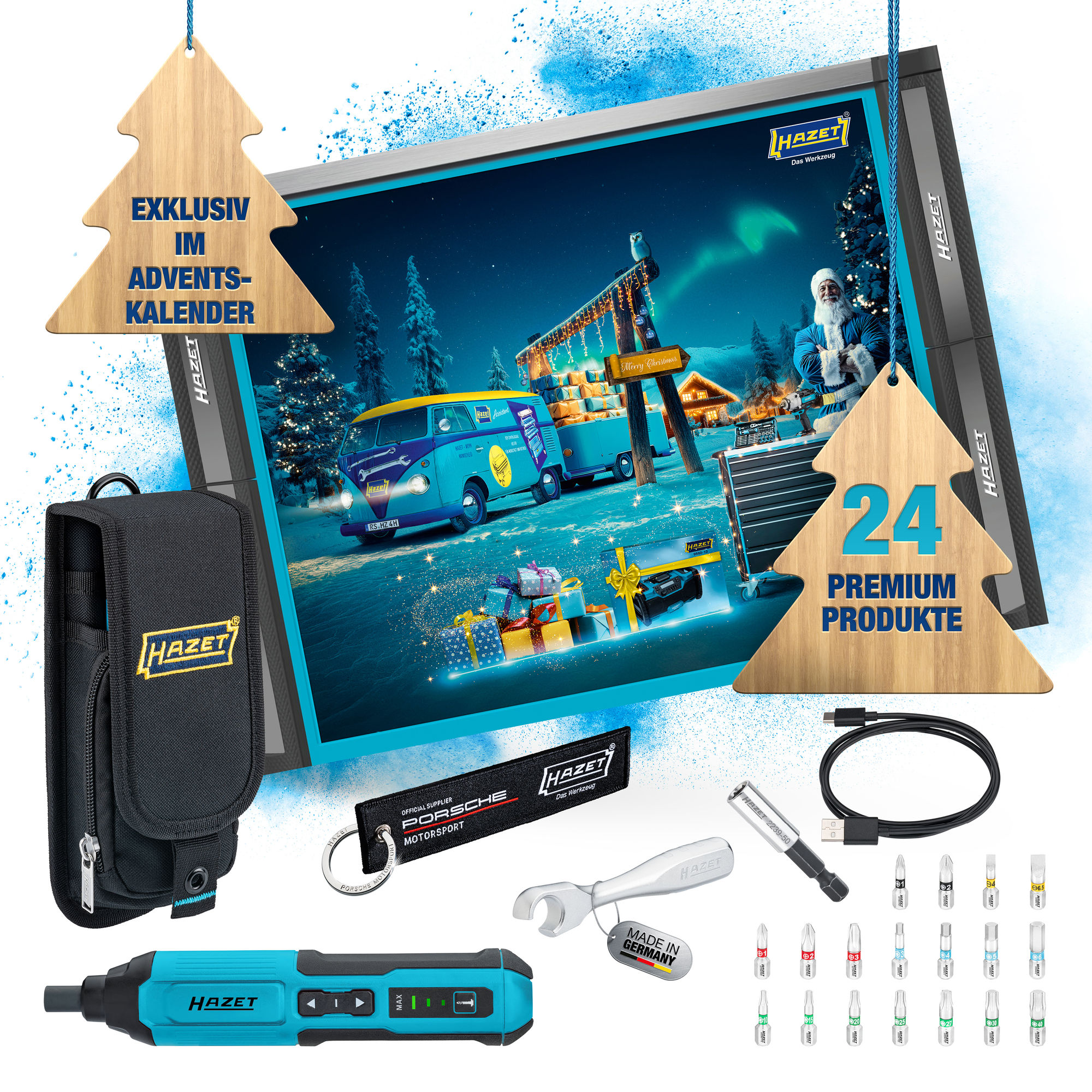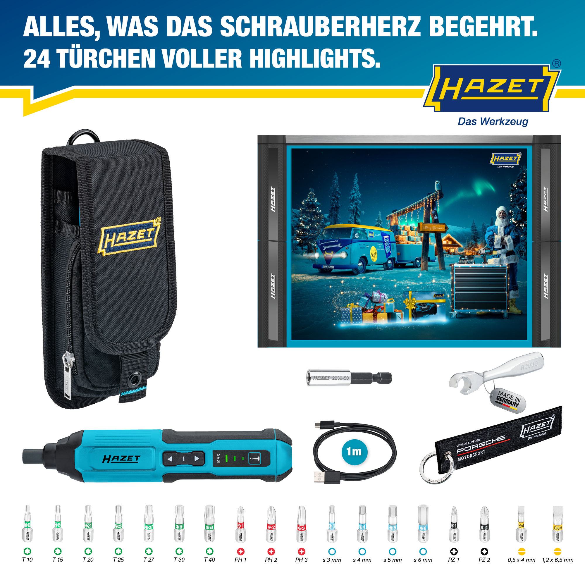 Produkteigenschaften: HAZET Werkzeug-Adventskalender 2025 – mit ¼″ Akku-StabschraubendreherDer HAZET Adventskalender 2025 bietet nicht nur festliche Vorfreude, sondern auch echte Profi-Werkzeug-QualitätHinter den 24 Türchen verstecken sich praktische Helfer für Hand- und Heimwerker, allen voran ein leistungsstarker ¼″ Akku Stabschraubendreher mit 5 Nm Drehmoment, drei einstellbaren Leistungsstufen und LED-Arbeitslicht. Eine moderne Ausstattung, verpackt im stimmungsvollen Kalenderdesign, die in keiner Werkstatt und in keinem Haushalt fehlen darf.Highlights im Kalender¼″ Akku Stabschraubendreher mit 3-Gang-Drehmoment-Einstellung (2,5 · 3,5 · 5 Nm), 3,6 V Lithium-Ionen Akku (2 Ah), 300 U/min und LED-Arbeitslicht.Magnetischer 1/4″ Adapter für Akku-Schrauber und Bohrmaschinen.18 hochwertige Bits (25 mm) mit allen wichtigen Antriebsprofilen (Schlitz, PH, PZ, Innensechskant, TORX).Vollstahl-Flaschenöffner im Design der HAZET Feinzahn-Umschaltknarre 863MB.Praktische Aufbewahrungstasche für Bits und Schrauber.Schlüsselanhänger im HAZET und Porsche Motorsport Design.Stimmungsvolles Kalenderformat (H 357 x B 455 x T 54 mm) als Hingucker.