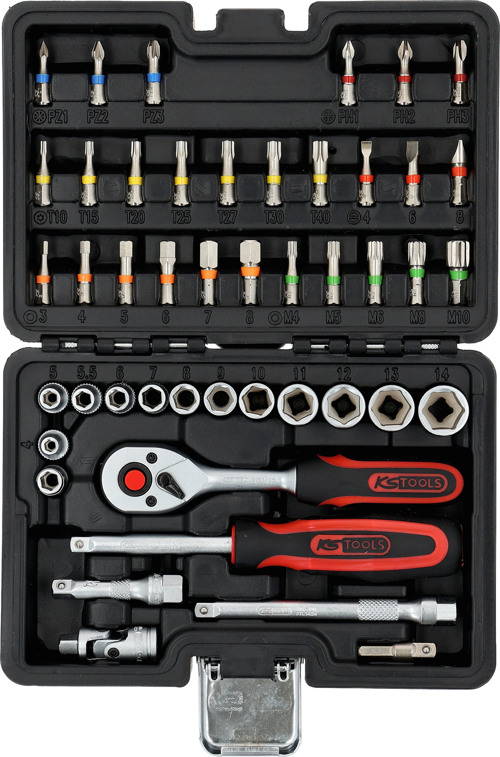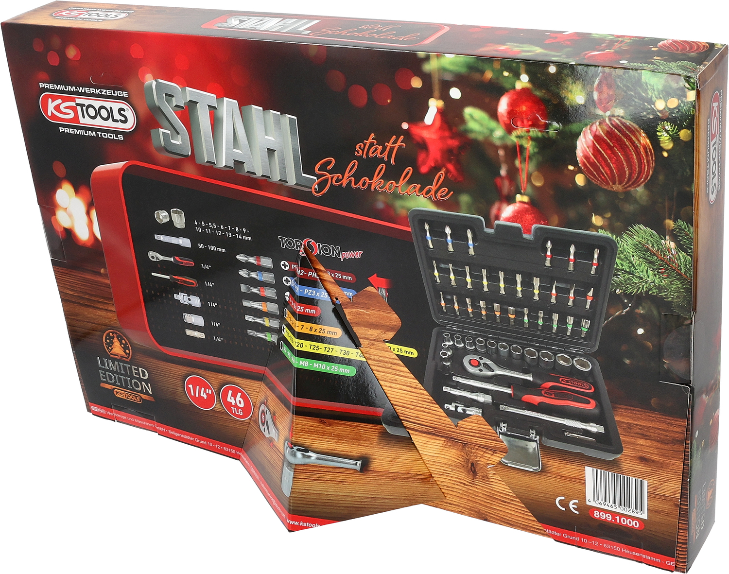 24 Türchen, 46 Premium-Schraubwerkzeuge:Profi-Qualität für den HeimwerkerSchokolade zur Adventszeit? Ist einfach out!Viel besser für die Gesundheit und die gute Laune ist dieser geniale Werkzeug-SatzEine ideale Mischung für Haus- und Handwerker, selbst an beengte Situationen im Alltag wurde gedachtEs ist das perfekte Geschenk für Ihre Liebsten zur Vorweihnachtszeit:Für jeden Heimwerker und für alle, die es noch werden wollen! Vorfreude ist die schönste FreudeWeihnachten ist kein Zeitpunkt und keine Jahreszeit, sondern eine HerzensangelegenheitDen KS Tools Werkzeug-Satz zu schenken, heißt Freude schenkenDas tägliche Lächeln ist das größte GeschenkBegeistert Profis und Heimwerker gleichermaßenDekorativer Hingucker in der AdventszeitSchenken Sie Ihren Liebsten einen außergewöhnlichen Adventskalender ohne SchokoladeFreuen Sie sich jeden Tag bis Heiligabend über ein neues Werkzeug für jeden Heimwerker das perfekte Geschenk für die VorweihnachtszeitTechnische Daten:Profi 1/4" Torsions-Bit-Satz bestehend aus:12x Sechskant-Stecknüsse: 4 - 5 - 5,5 - 6 - 7 - 8 - 9 - 10 - 11 - 12 - 13 - 14 mm27x Torsions Bits in 1/4" Antrieb x 25 mm Länge:je 1 Bit PH1, PH2, PH3je 1 Bit PZ1, PZ2, PZ3je 1 Bit Innensechskant 3, 4, 5, 6, 7, 8 mmje 1 Bit Torx T10, T15, T20, T25, T27, T30, T40je 1 Bit Schlitz 4, 6, 8 mmje 1 XZN M4, M5, M6, M8, M101x 1/4" Vierkant-Adapter, für Bitratschenschlüssel1x 1/4" Kardangelenk1x 1/4" Verlängerung mit Antriebssechskant, 50mm1x 1/4" Verlängerung mit Antriebssechskant, 100mm1x 1/4" Bit-Adapter-Stecknuss, mit Spannring1x 1/4" Vierkant-Schraubendreher, 150mm1x Umschaltknarre, 1/4" mit 72 Zähnen1x stabiler 2-komponenten KunststoffkofferLieferumfang:1x KS Tools Adventskalender 2025 (inkl. Steckschlüssel-Satz 46-tlg.)