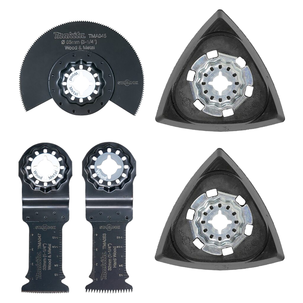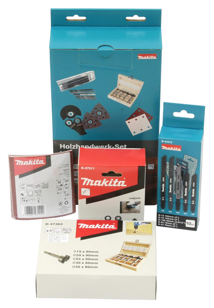 - **1x Makita Multifunktionswerkzeug-Set (B-67511) Schreiner Starlock, 5-tlg.**: Spezial-Zubehör für Multitools, geeignet für präzise Tauchschnitte und Feinarbeiten in Ecken.