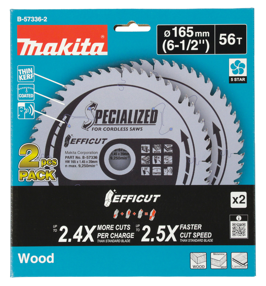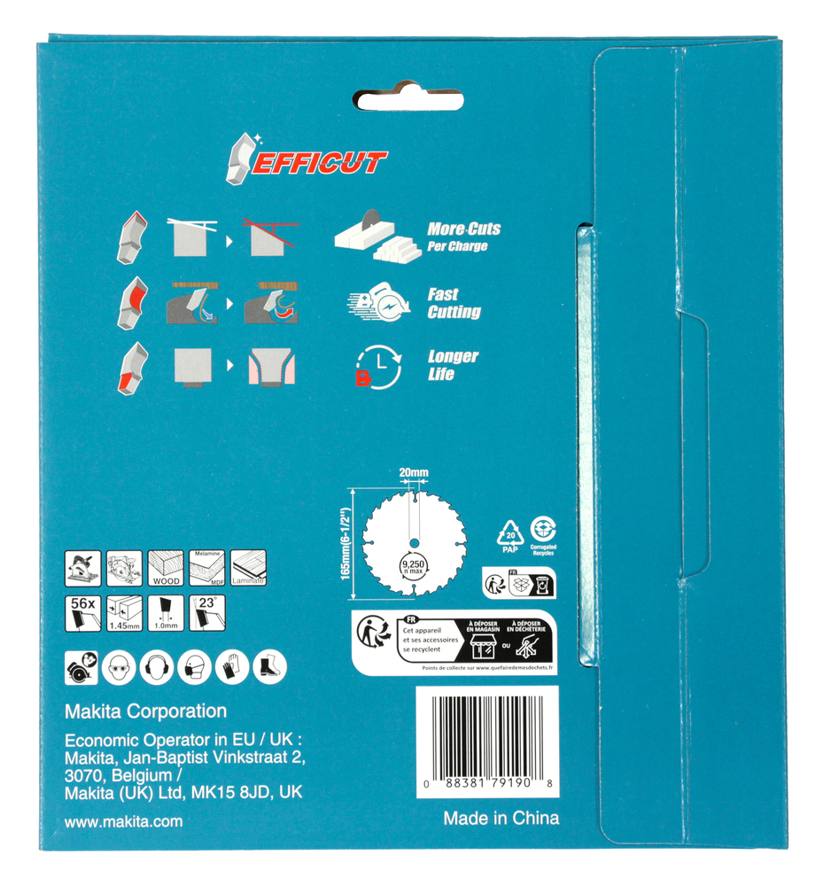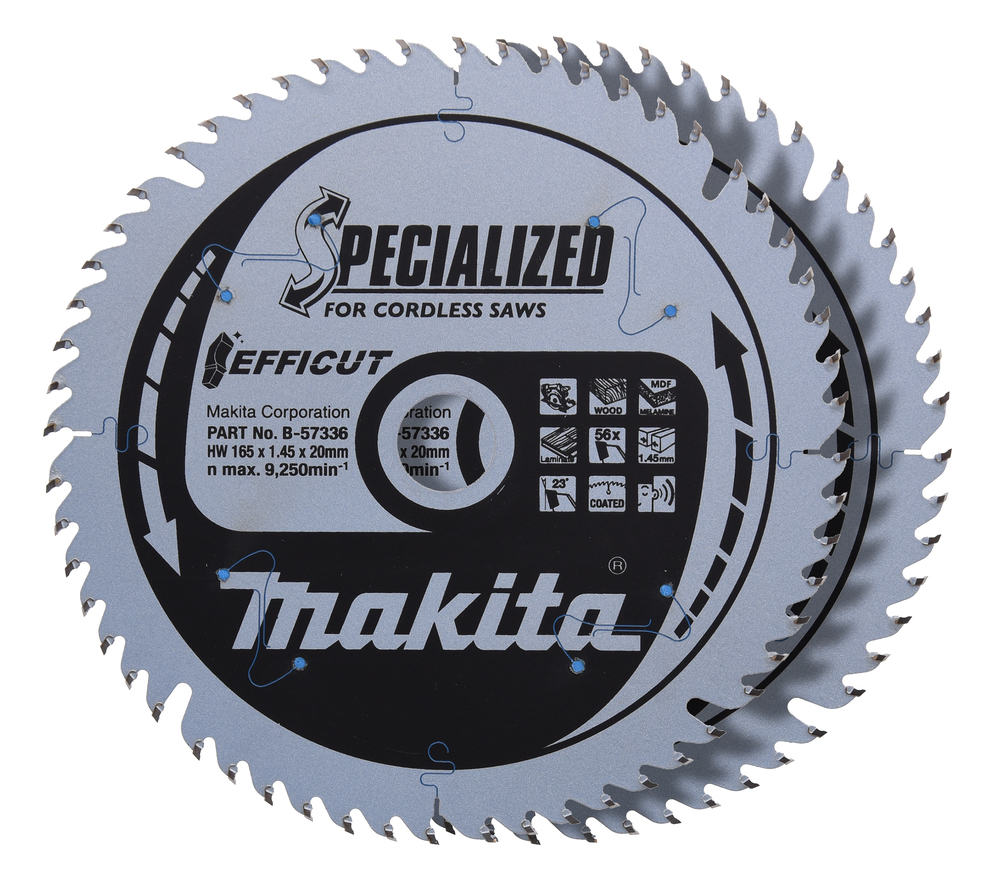 Produkteigenschaften:EFFICUT - schneller und effizienterDas EFFICUT-Sägeblatt ist speziell für Akku-Handkreissägen entwickeltDurch die besondere Zahngeometrie und einer Stärke von nur 1,45 mm lässt sich Holz bis zu 2,5 mal schneller schneiden, als mit herkömmlichen SägeblätternDas bringt eine Zeitersparnis von bis zu 60 %. Zudem sind mehr Schnitte mit einer Akku-Ladung möglichEFFICUT Sägeblätter stehen für schnelleres und effizienteres Arbeiten und eignen sich für eine Vielzahl von MaterialienDazu gehören unter anderem Holz, Kunststoff, Metall, Aluminium, Verbundwerkstoffe und weitere Materialien.Durch die besondere Zahngeometrie erhöht sich die Schnittgeschwindigkeit auf bis zu 250% im Vergleich zu einem Standard-Sägeblatt. Dies bedeutet eine Zeitersparnis von bis zu 60 %.Aus diesem Grund eignen sich die Sägeblätter speziell für Akku-Maschinen. Schnellere Schnitte bedeuten zugleich mehr Schnitte mit einer Akku-Ladung - die Akku-Laufzeit kann sich um das 2,4-fache verlängern.Die besondere Zahngeometrie der EFFICUT-Sägeblätter vereinen drei weitere Besonderheiten:1. Die speziell geschärften Zahnköpfe sorgen für sauberere Schnitte2. Die “spanbrechende” Zahnform sorgt für einen hervorragenden Spanabtransport3. Der verjüngte Segmentboden der Zähne mindert den Reibungswiderstand für einen ruhigeren LaufTechnische Daten:Sägeblatt: 165 mmBohrung: 20 mmSchnittbreite: 1,45 mmZähnezahl: 56Zahnwinkel: 23°Zahnform: EfficutVPE: 1Lieferumfang:1x Makita EFFICUT Kreissägeblatt-Set 165x20x56Z 2-tlg.