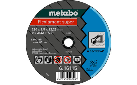 Deutschland 07022/720 Metabo Flexiamant super 230x2,5x22,23 Stahl, TF 42 (616103000) Artikel-Nr.: 616103000 EAN: 4007430437365 Hersteller: METABO